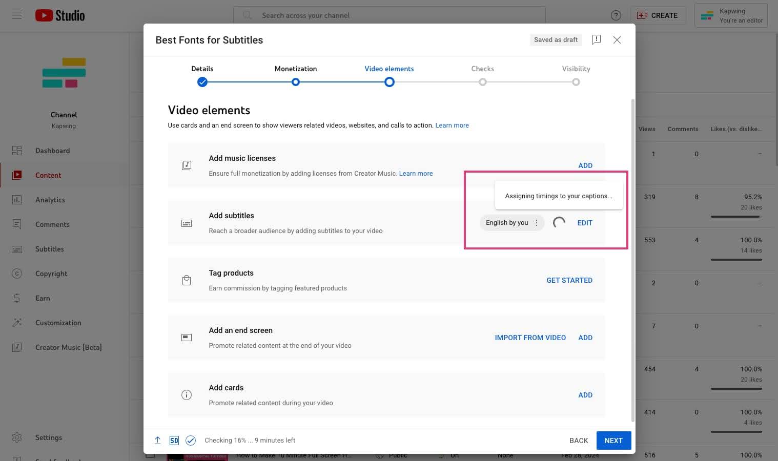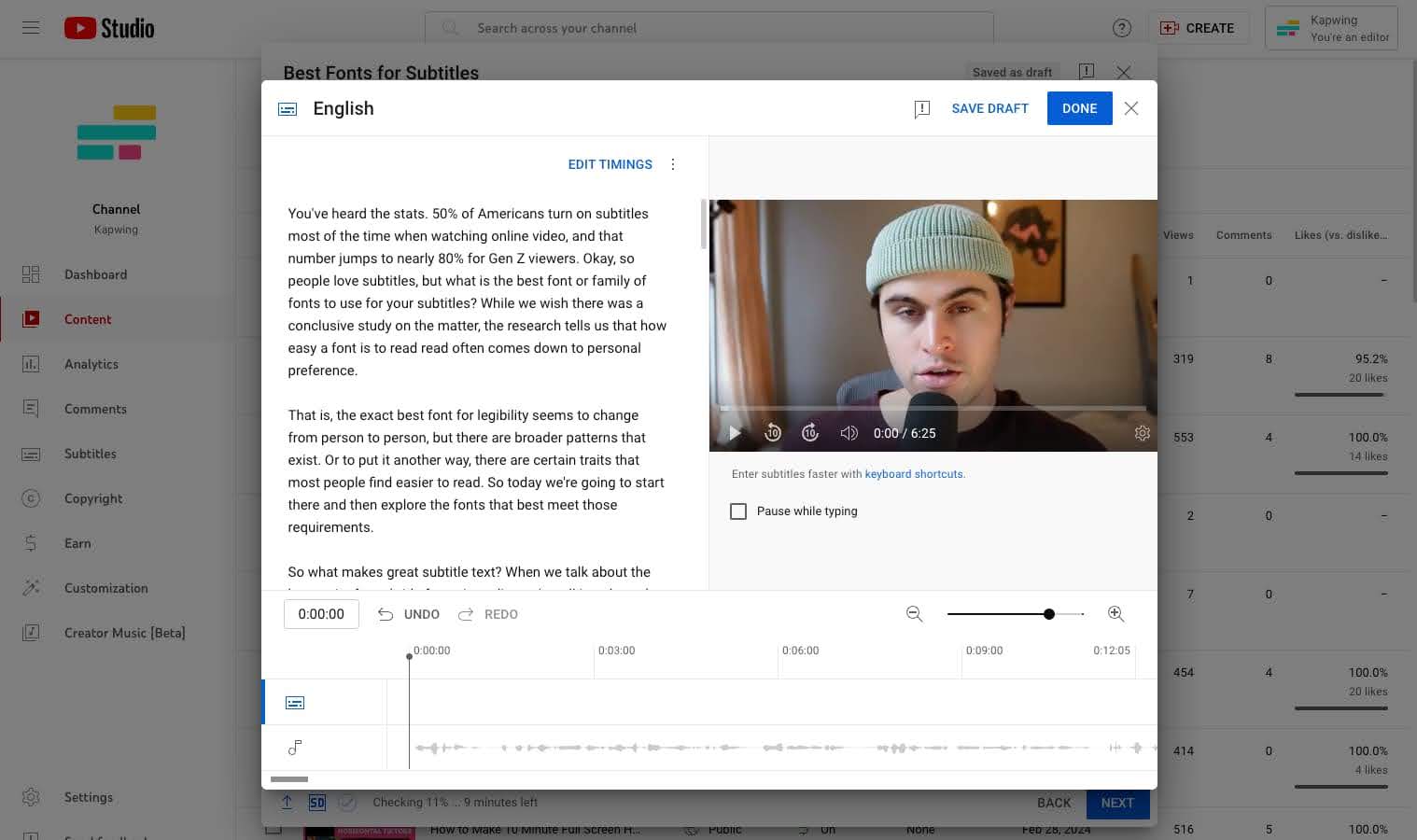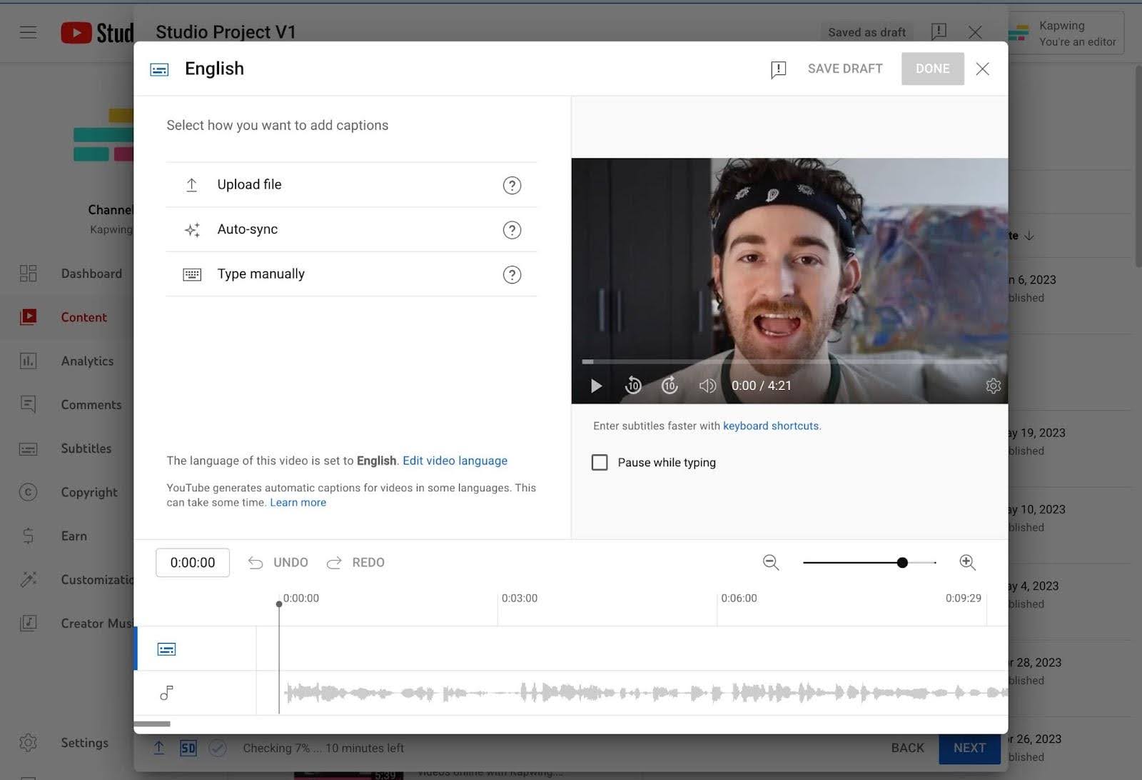 It may take YouTube several minutes or more to fully process the transcript and sync it with your video’s spoken audio. You can hit “Save draft” and close out of the the subtitle editor window while you wait. If you do so, you’ll be able to see the subtitles processing from the main upload portal in YouTube Studio.