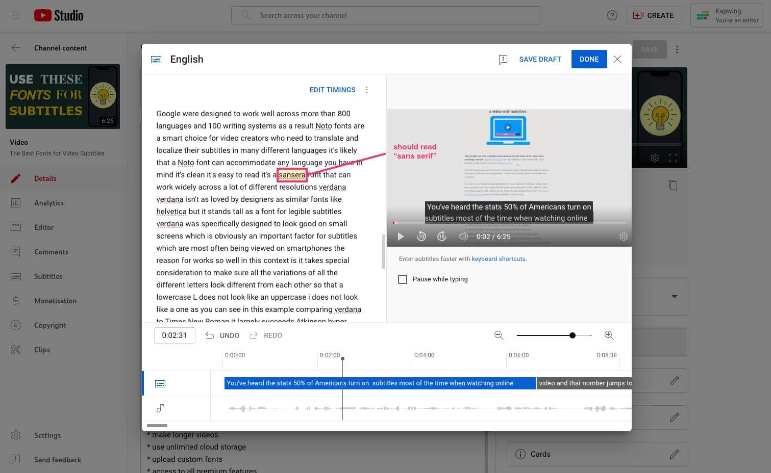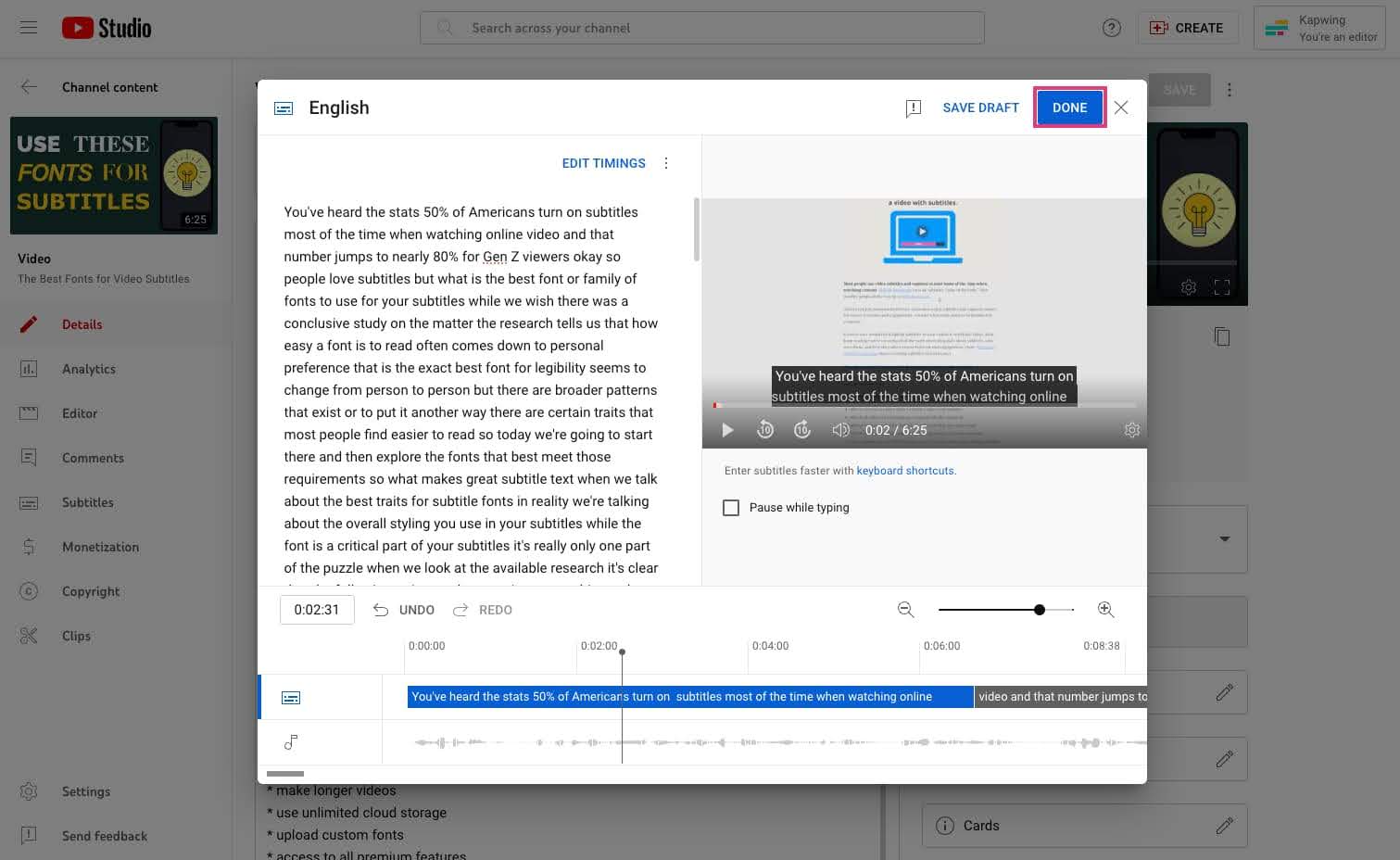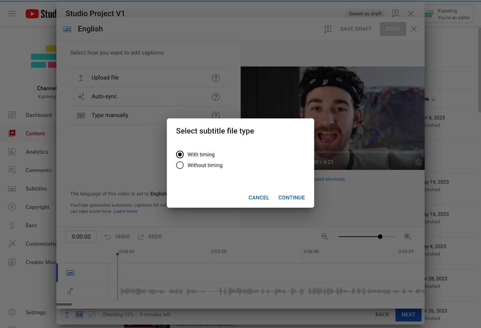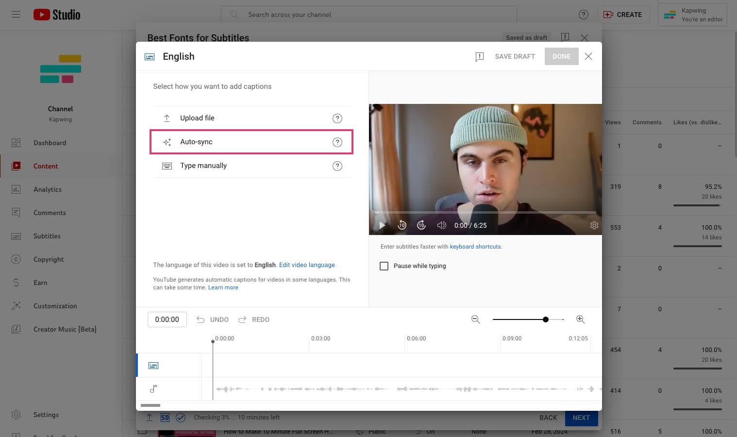 It may take YouTube several minutes or more to fully process the transcript and sync it with your video’s spoken audio. You can hit “Save draft” and close out of the the subtitle editor window while you wait. If you do so, you’ll be able to see the subtitles processing from the main upload portal in YouTube Studio.