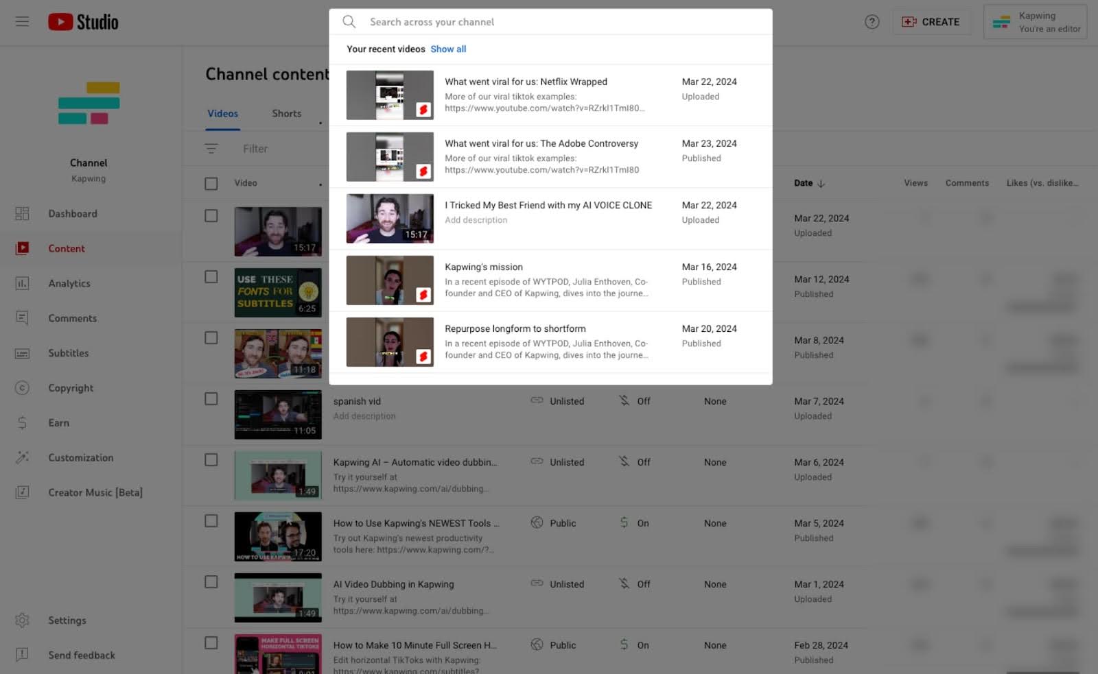 Export your video from Kapwing and upload it to your YouTube channel. No need to worry about uploading a caption file or a subtitles file, since the captions are already baked in.