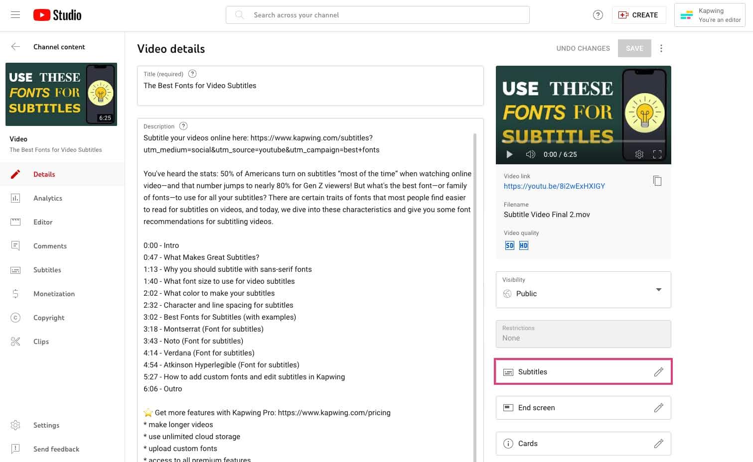 You can add subtitles to any YouTube videos you have editing and publishing permissions for. To add subtitles to any YouTube video, you can manually add captions, type them in, allow YouTube to auto-generate captions, embed your own captions with a video editor like Kapwing, or upload a subtitle or caption file. Adding subtitles will make viewers more likely to watch your whole video.