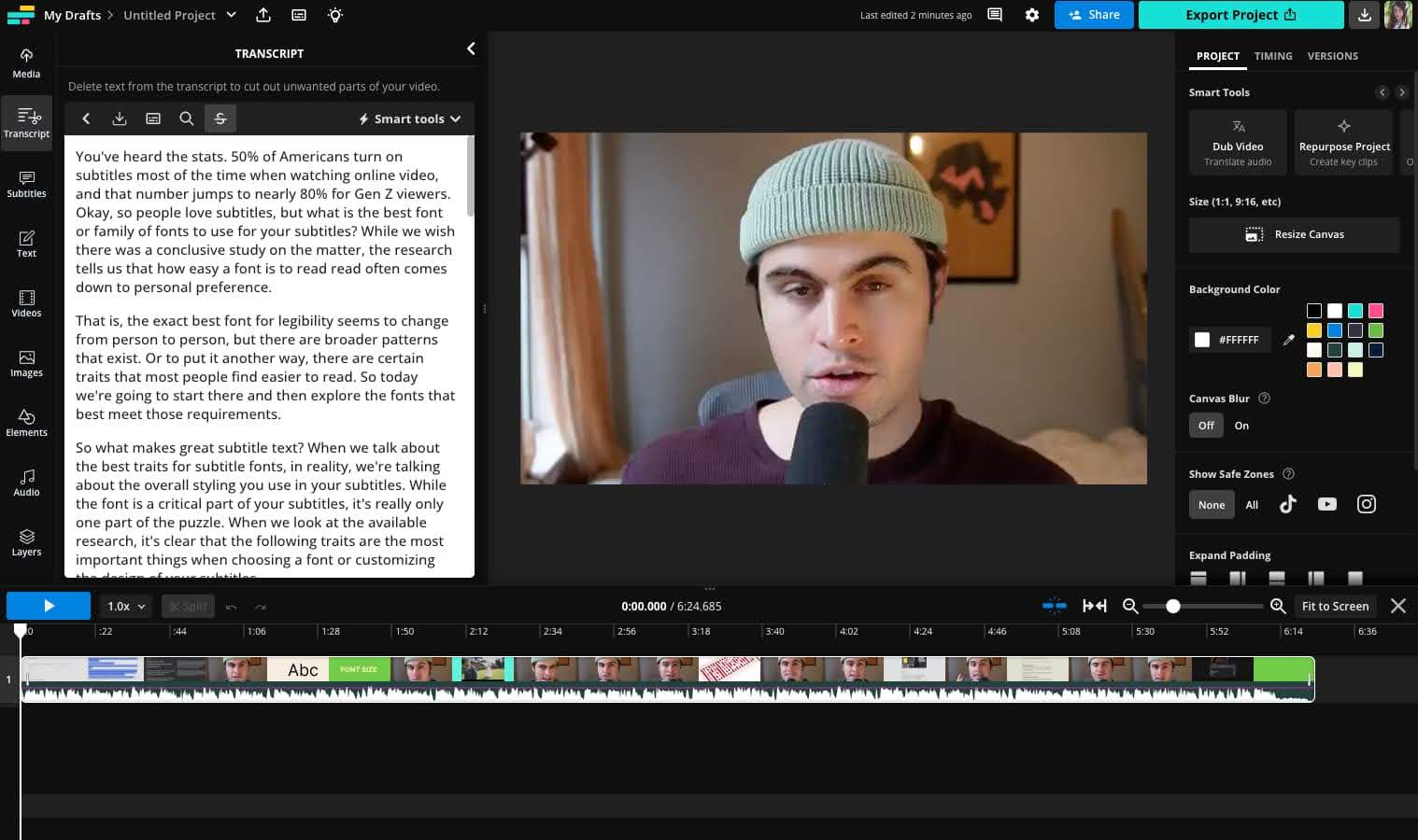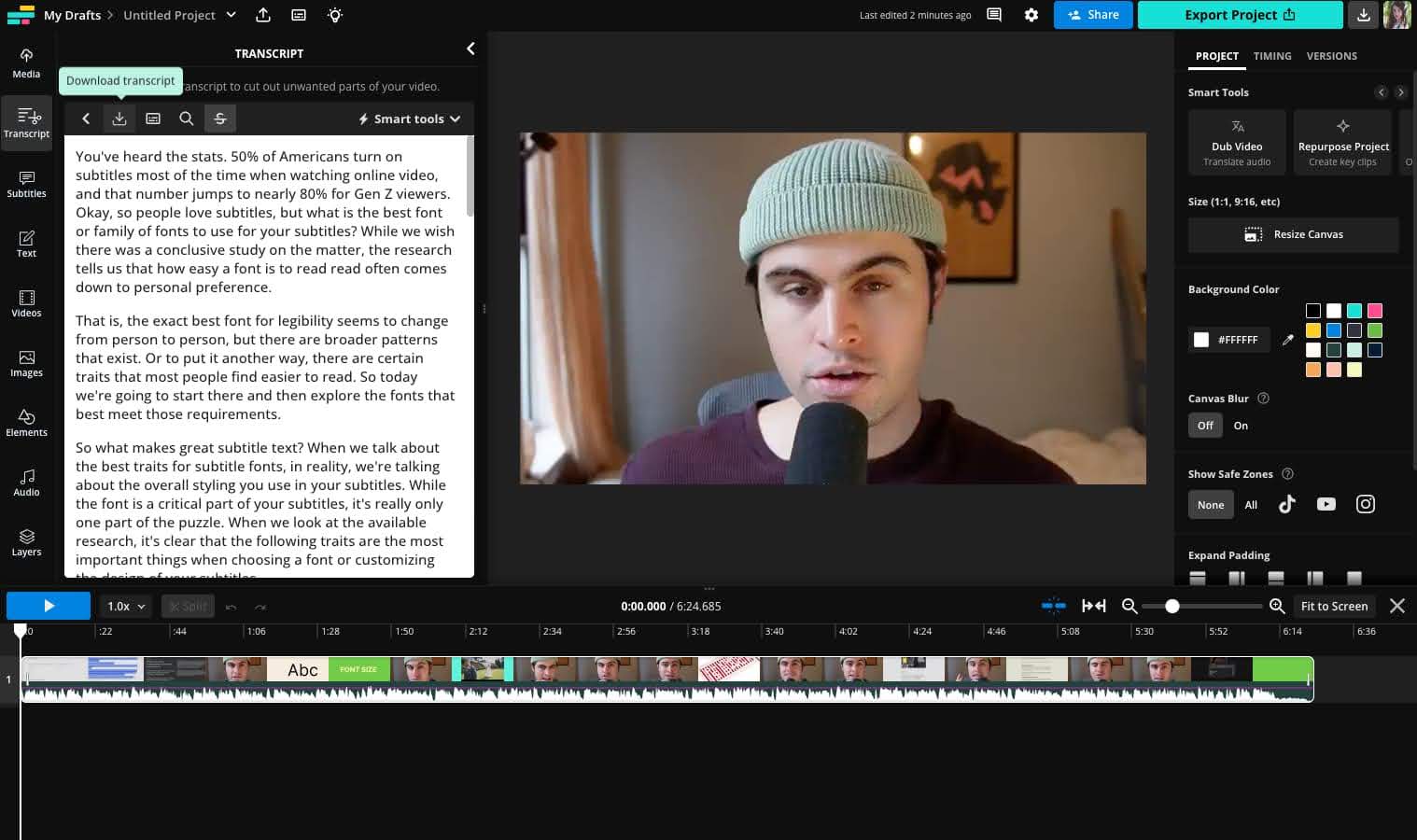 To avoid needing to heavily edit your synced video subtitles, we recommend using an actual transcript of the video, so it’s word-for-word perfect—or as near perfect as modern speech recognition technology can get us (which is pretty near). You can quickly generate a transcript using Kapwing’s AI-powered transcription tool.
