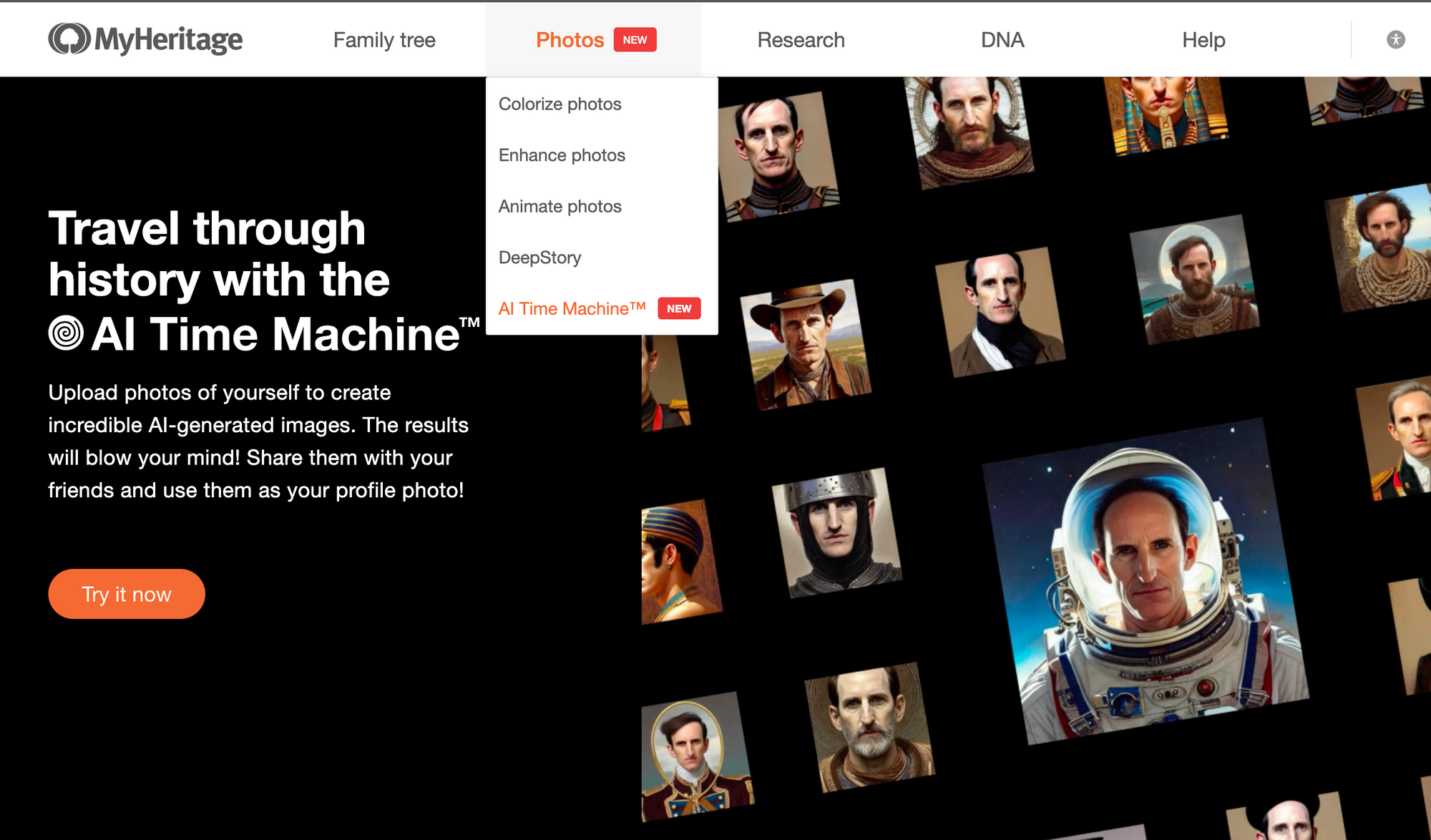 You'll find the AI Time Machine tool under the Photos drop down in their navigation menu. Click on the button to "Try it now."