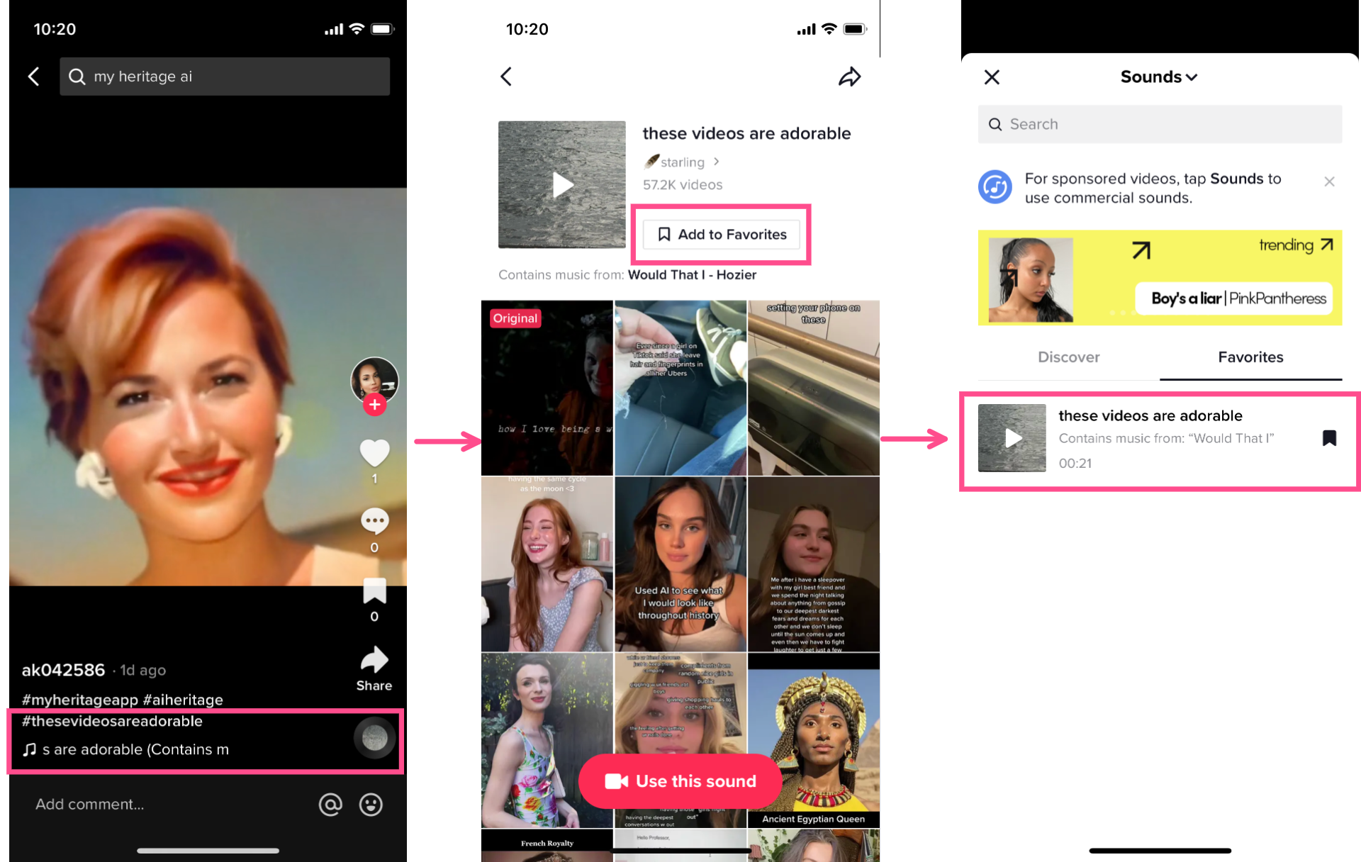 This works best if you recently saved or liked a video using the audio, although you could also use the search function from your home page. Tap on the audio at the bottom of the video then click on the "favorite" icon to save the sound to your favorites.
