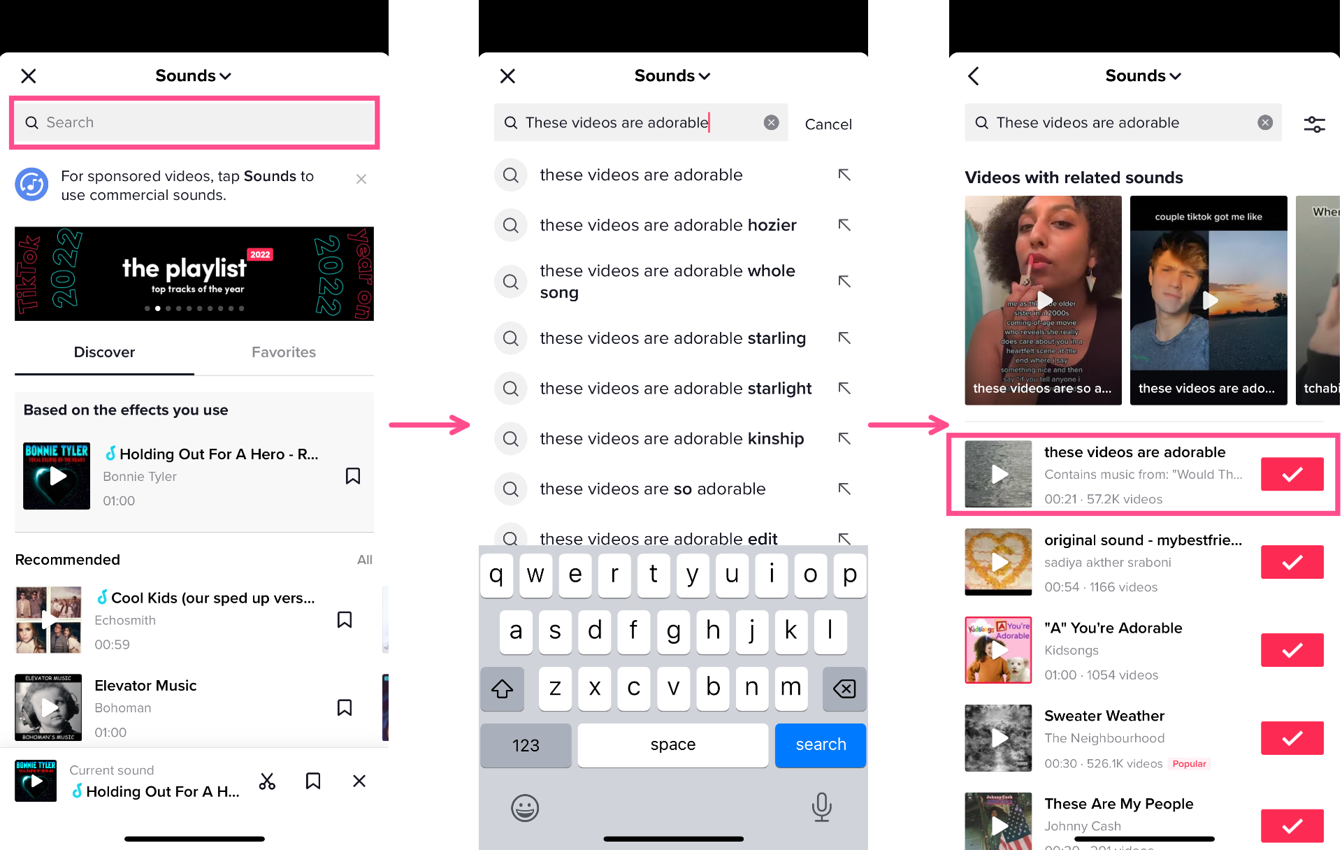 Type the name of the audio you want into the search bar. In this example, I'm searching for "these videos are adorable" by the creator starling that I mentioned above.