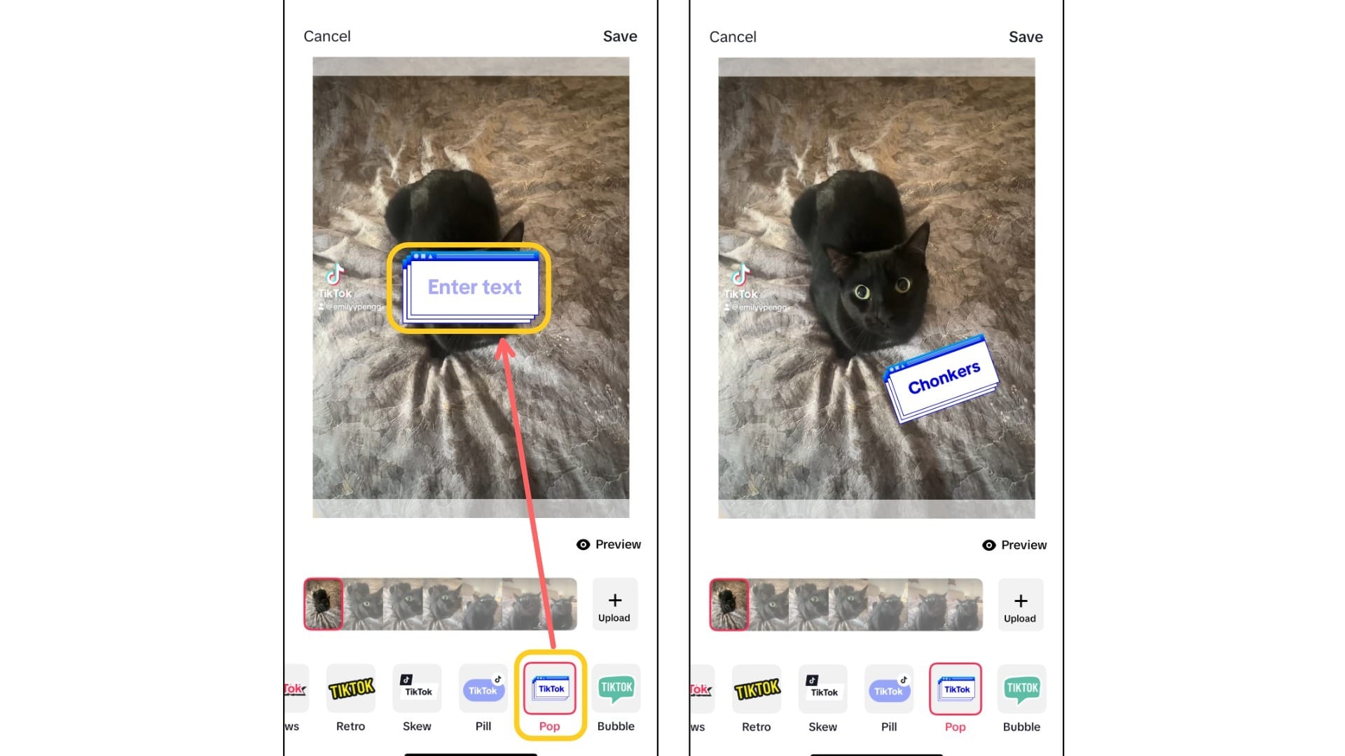 - For example, in the thumbnails below, the image on the left is a stronger TikTok cover photo because the text is bold, high-contrast, and easy to read at a glance. The image on the right is a weaker example since the text is small, low-contrast, and blends into the background.
