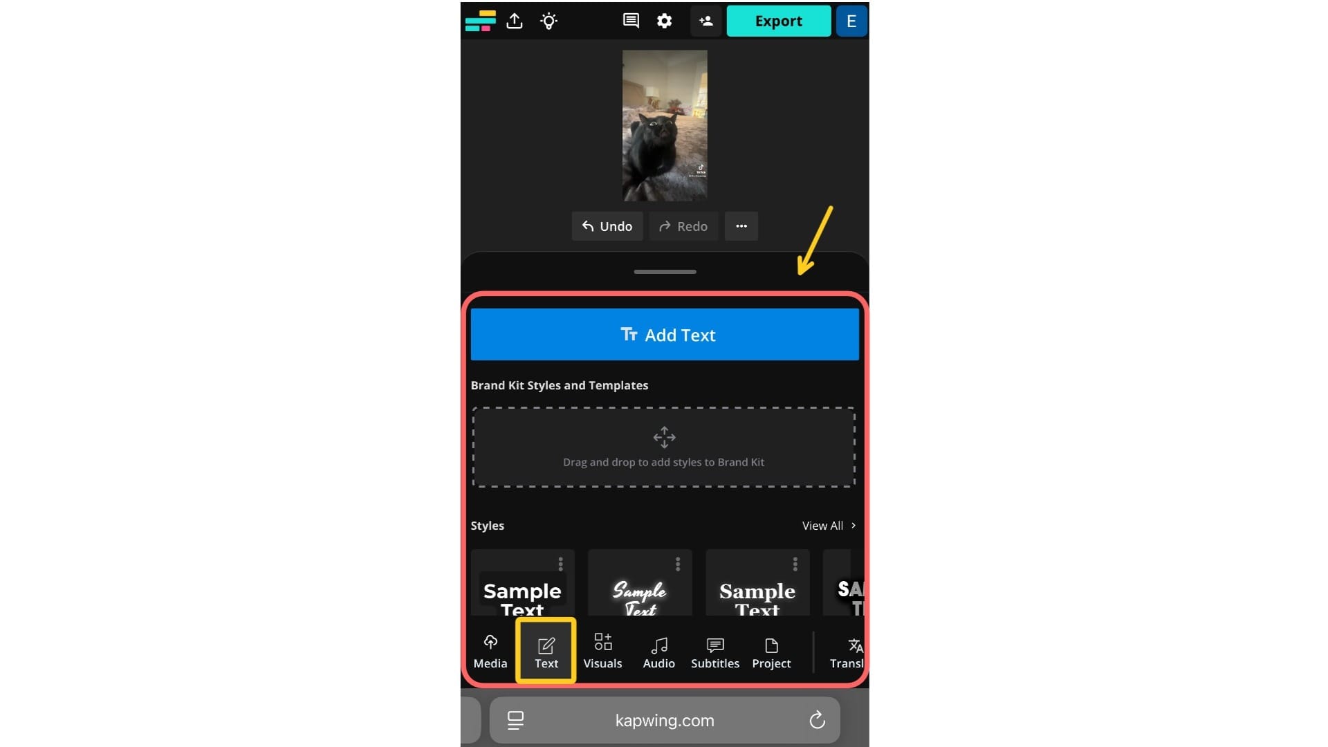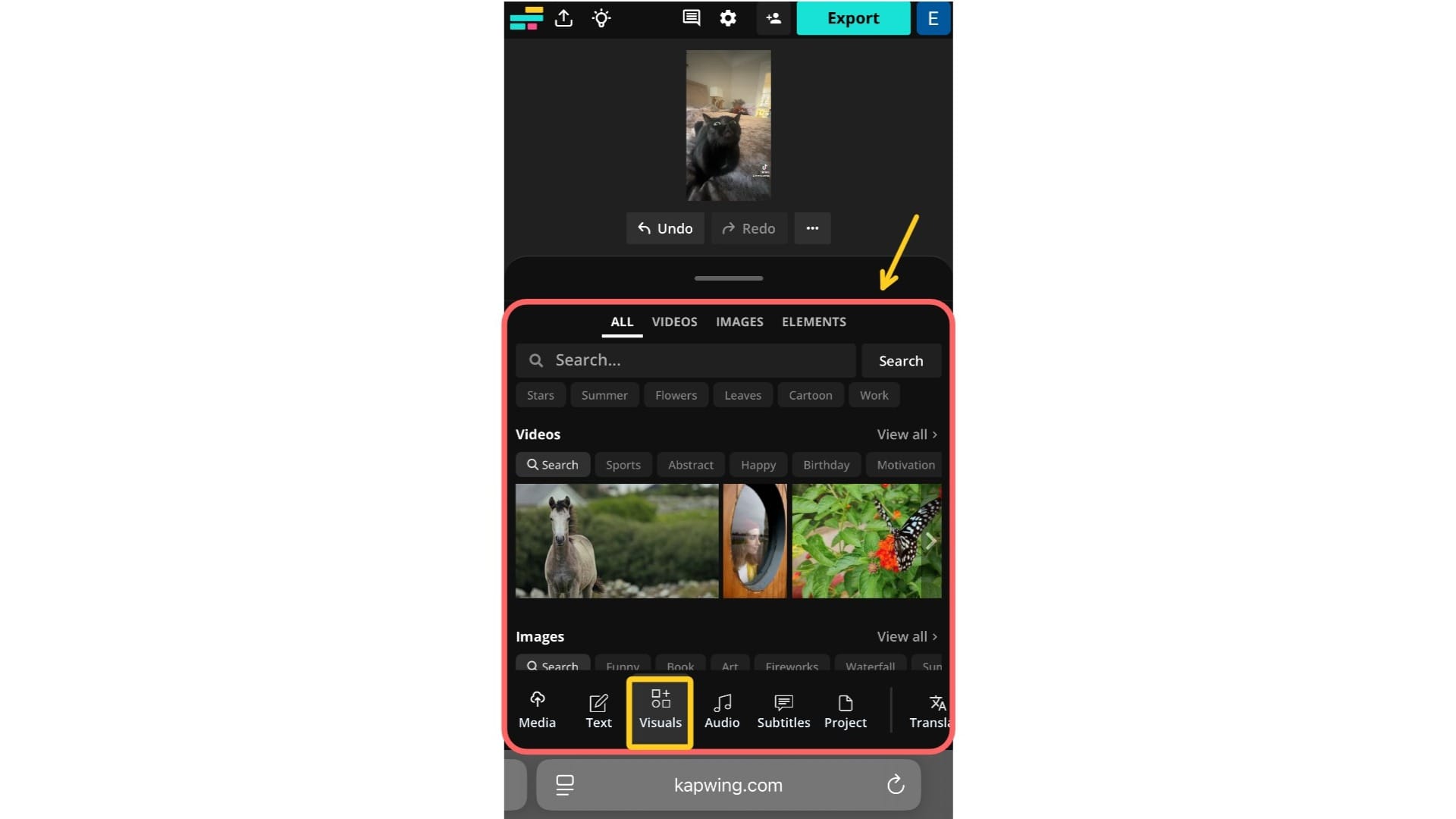 Next, add elements that will make your TikTok cover photo stand out. All of these tools can be found in the Text and Visuals sections on the left-hand toolbar in Kapwing. From there, you can add: