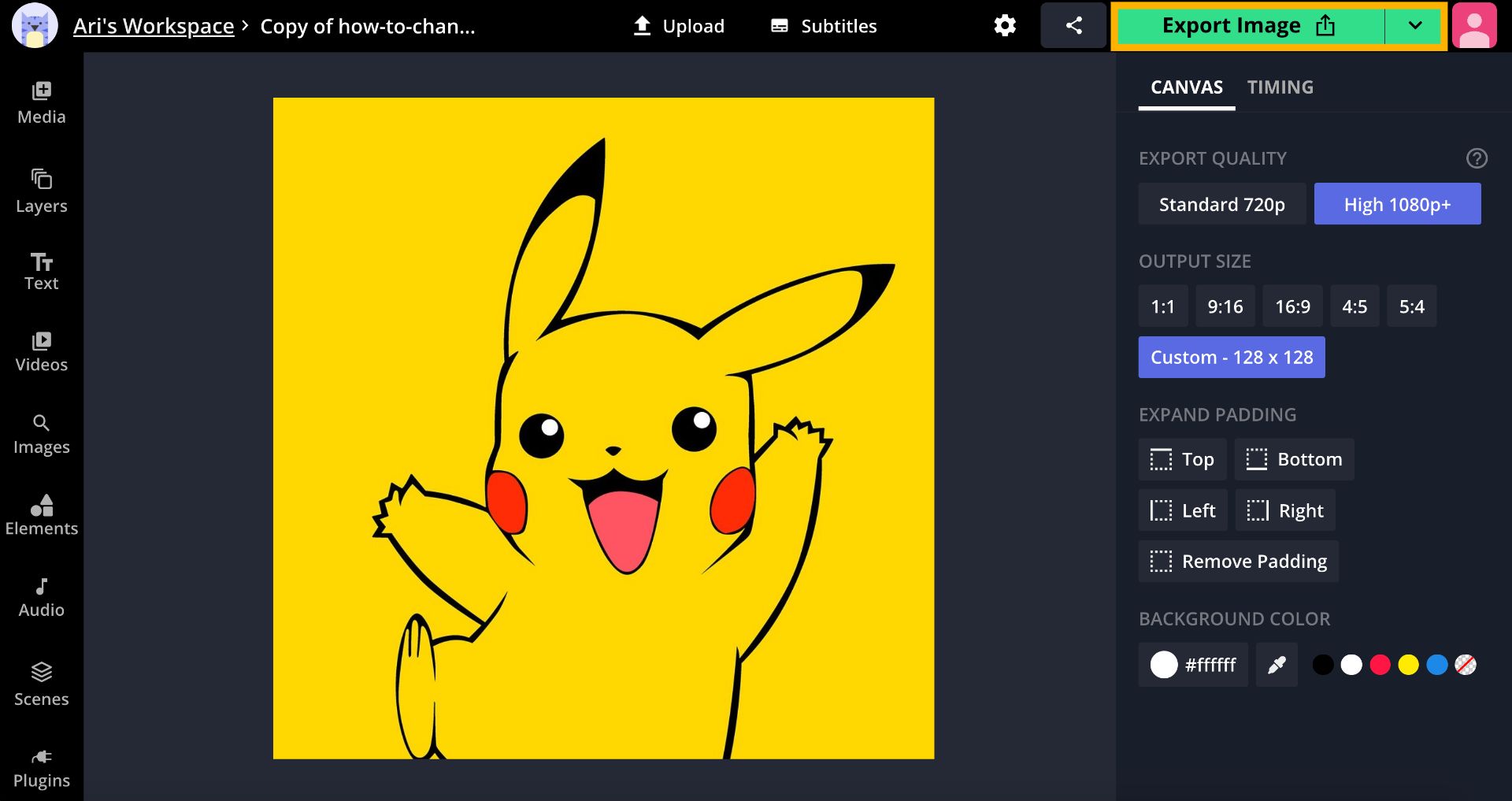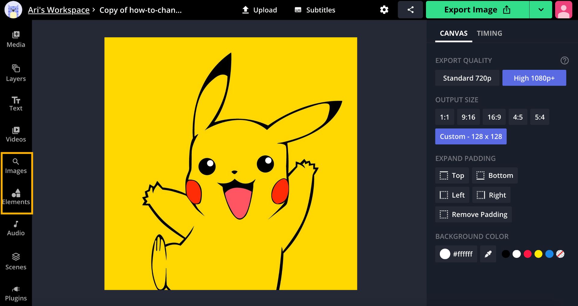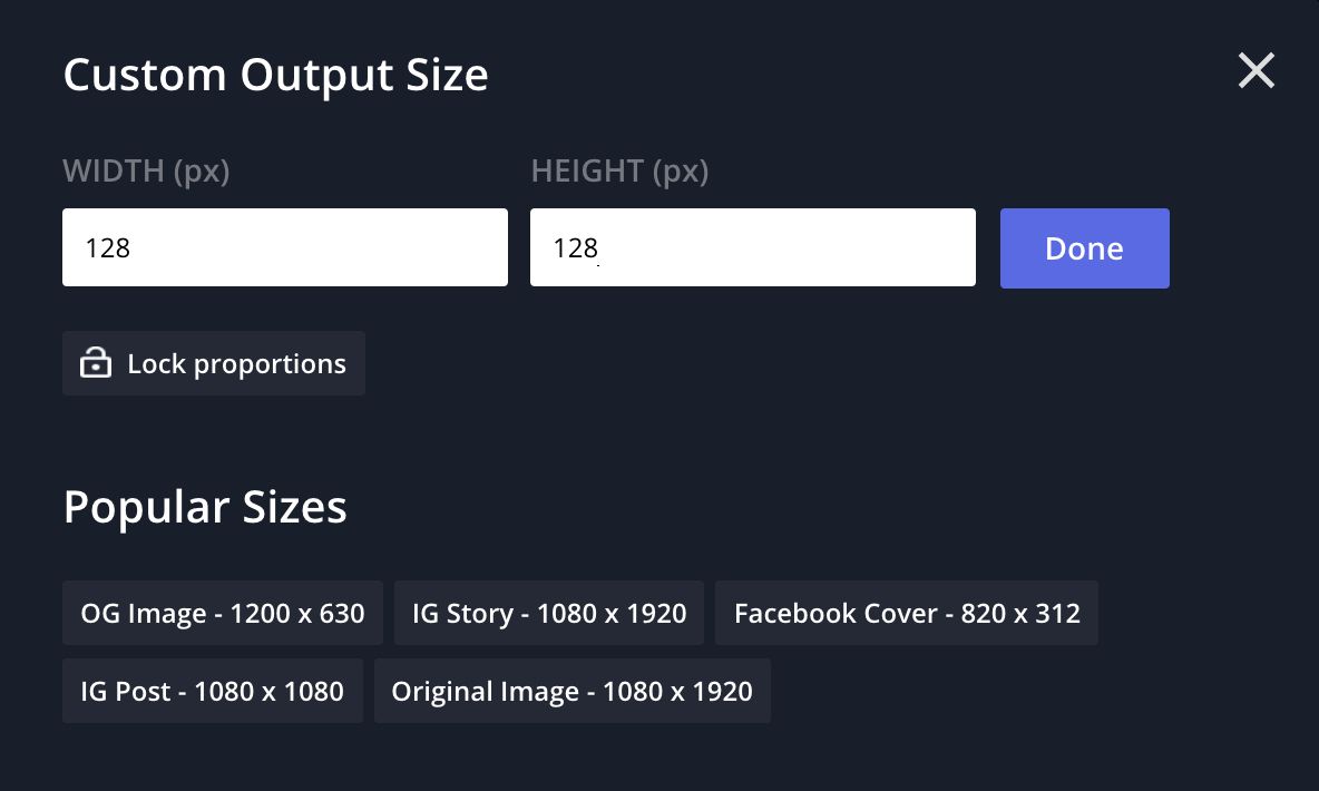 Drag and drop a PNG, JPG or GIF, click "Upload," or paste a link to import your avatar into the Studio, then click "Custom" under "Output Size" and change the dimensions to 128x128.