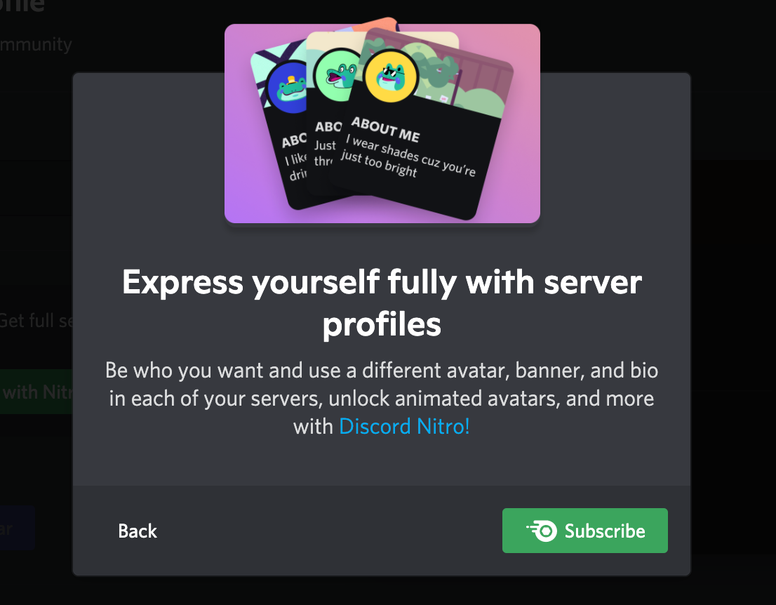 Note that you must be a Nitro subscriber to have different avatars for different servers. Free users will see a promo to upgrade to Discord Nitro