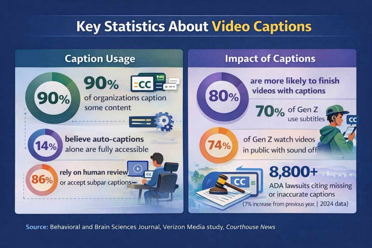 The legal stakes are real: in 2024, over 8,800 ADA lawsuits were filed — a 7% increase from 2023 — with missing or inaccurate captions cited as a common accessibility barrier. The FCC mandates 99% accuracy for broadcast captioning, and the European Accessibility Act (effective June 2025) requires closed captions for all public-facing audiovisual content in the EU.