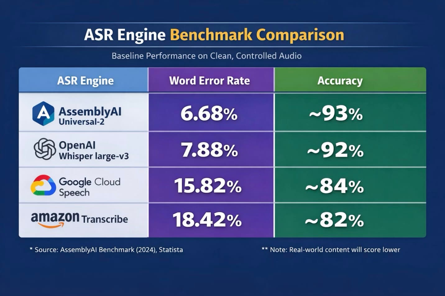 For context, most auto-subtitle tools use one of these core ASR (Automatic Speech Recognition) providers (although this isn't an exclusive list), making them a good baseline for accuracy tests. Here's how they perform on clean, controlled audio: