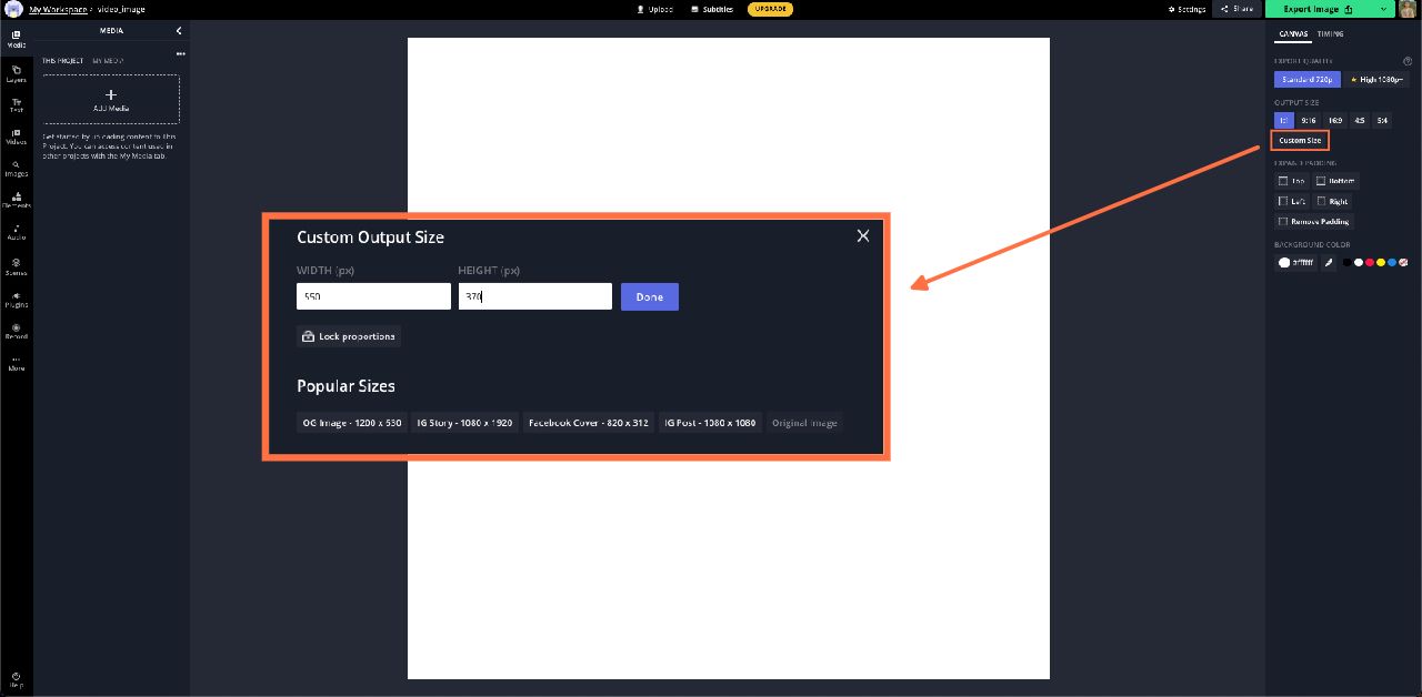 3. Select "Custom Output Size" in the right sidebar and enter the dimensions 550 pixels for the width and 370 pixels for the height.