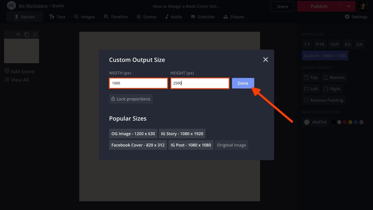 To resize your cover, first deselect your image by clicking somewhere in the background space of the editor. Then look to the right under "Output Size." Click "Custom" to input your desired pixel height and width.