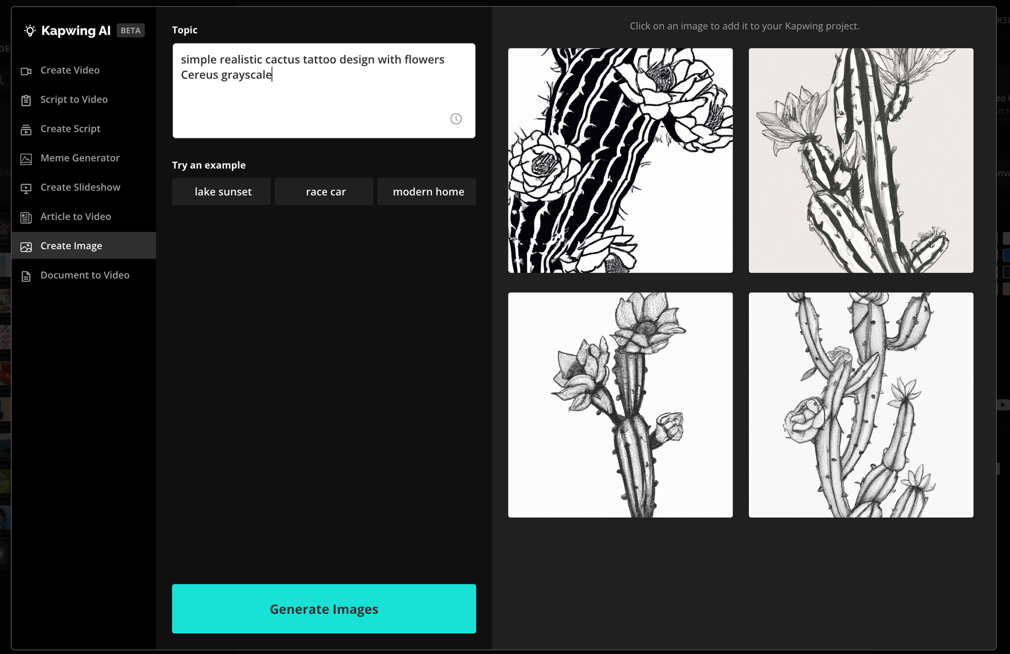 Try using Kapwing's embedded AI image generator to get ideas for your tattoo design. Click on the lightbulb icon in the top navigation bar to open the AI modal. Then, type in a text prompt to describe the tattoo you want. Refine the prompt to get closer to your vision. Note that free users can try the AI Generator twice, but will need to upgrade for unlimited image generations.