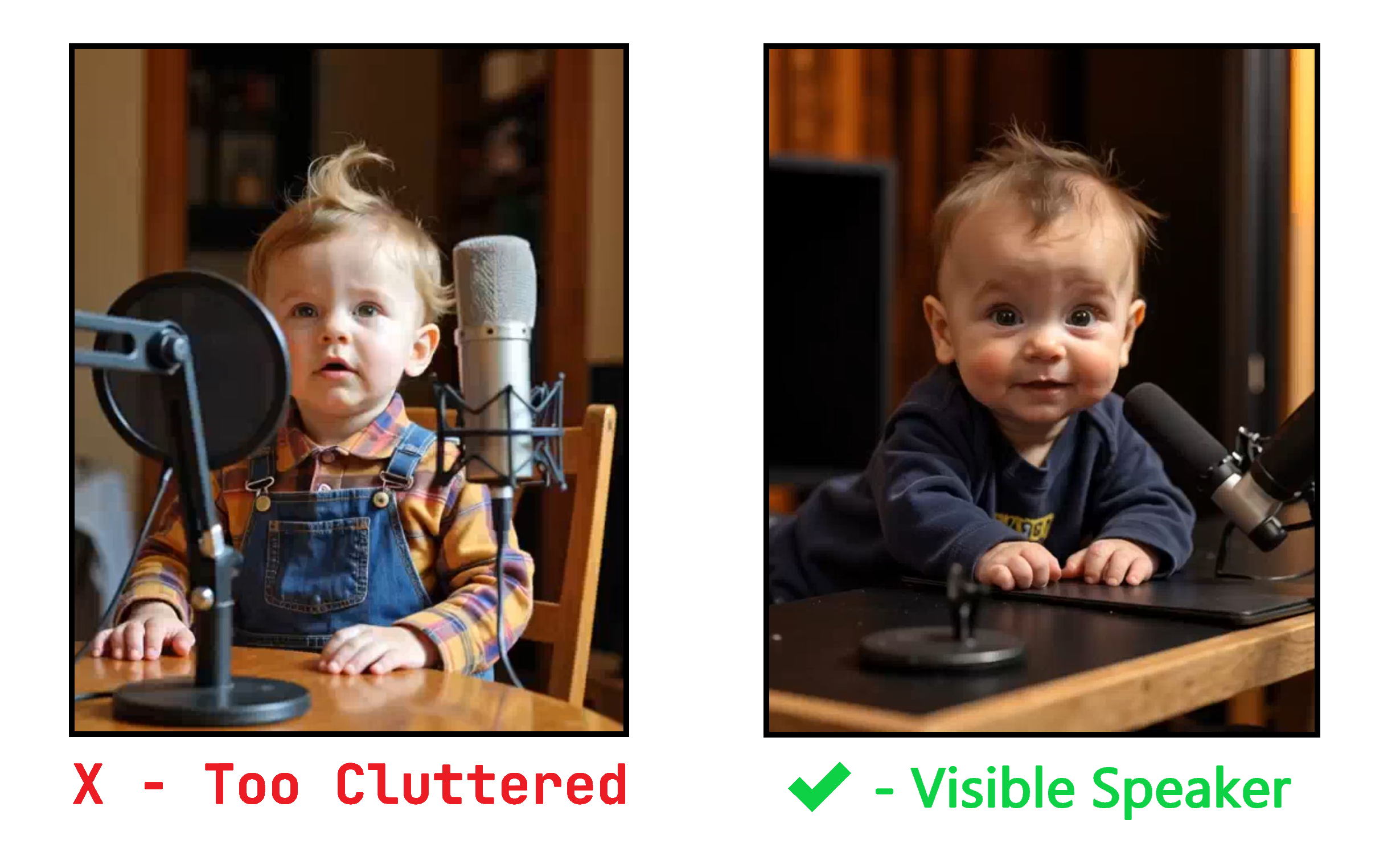 - Describe the speaker: Mention traits like hair color, hairstyle, facial expression, outfit, and energy level—especially if you're trying to make the baby look like a version of yourself.