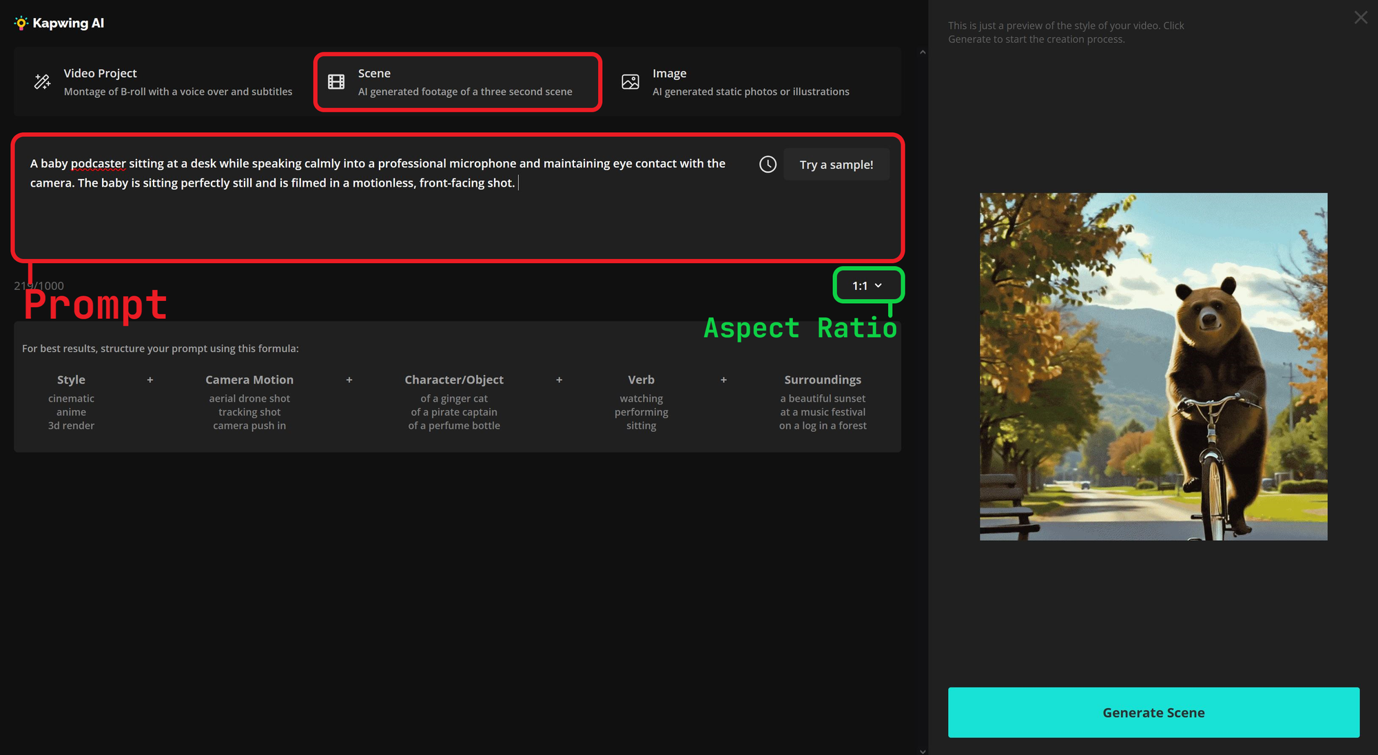 From here, a prompt window will appear where you can describe the scene you want to generate. This is where you’ll create your AI baby spokesperson who will appear in the final video. A few things to keep in mind when writing your prompt:
