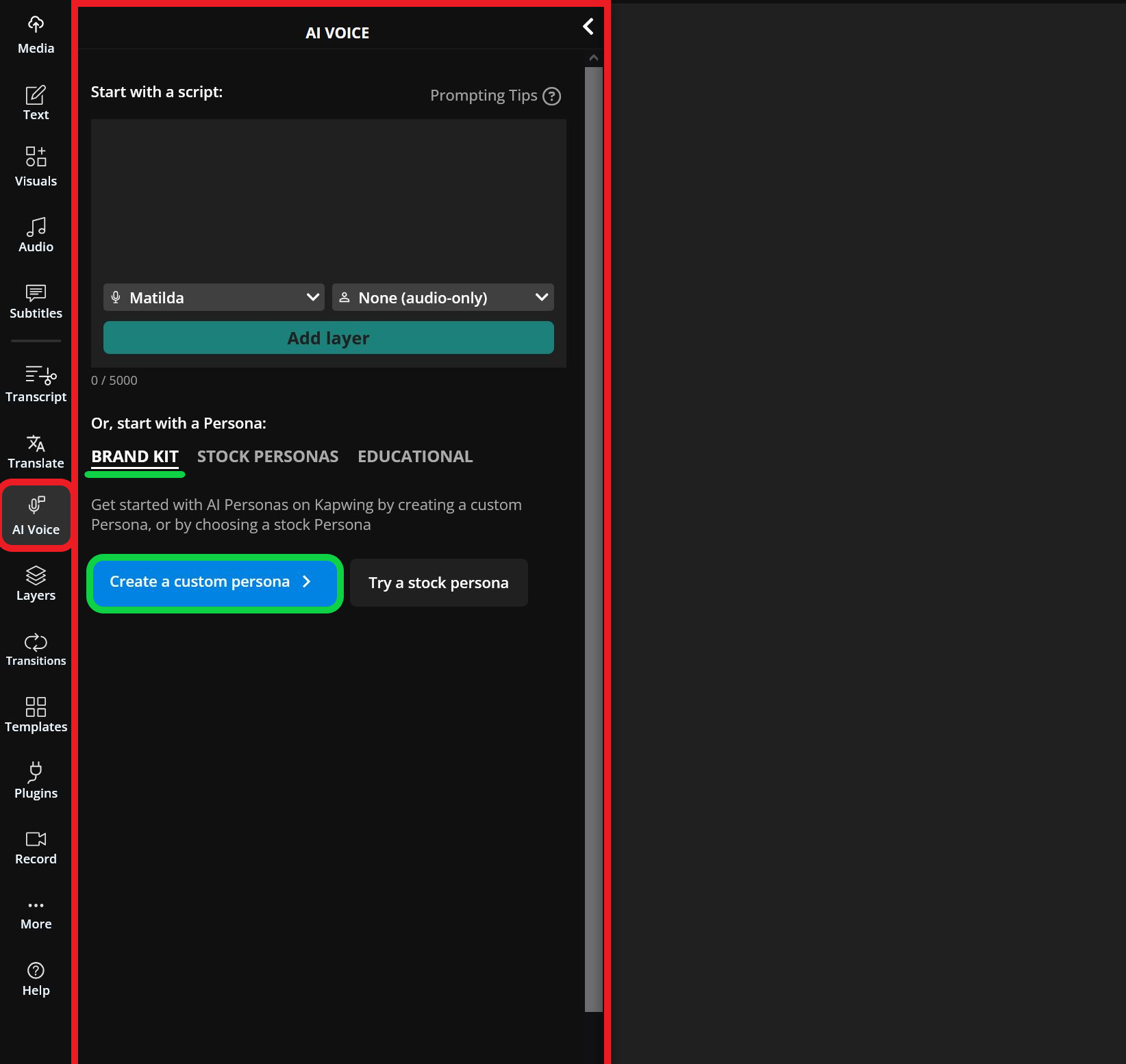 To begin, select the blue Create a custom persona button under the Brand Kit section.