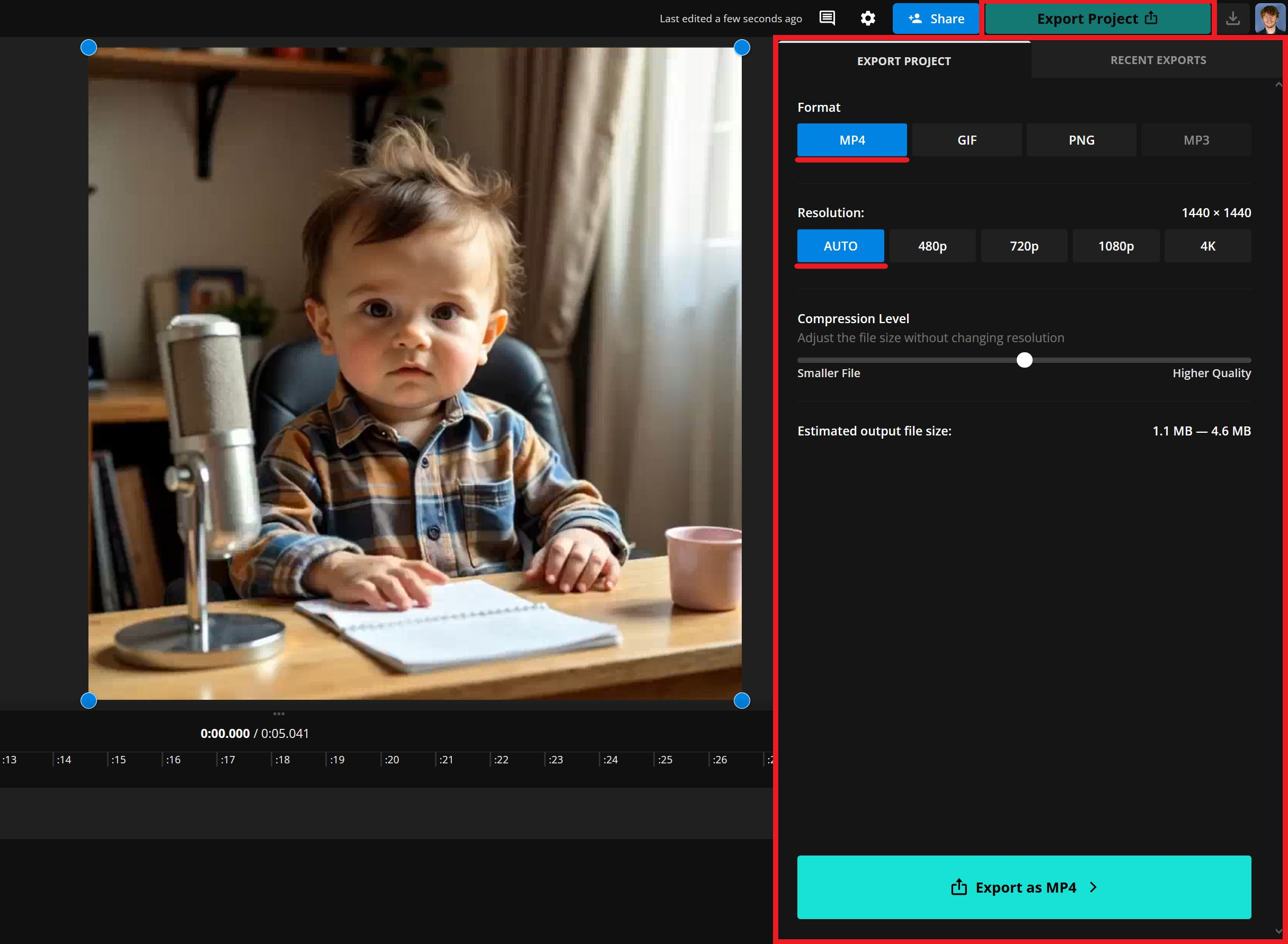 After your video is generated, it’s time to export. Click the Export Project button in the top right corner, and make sure your export settings match your needs.