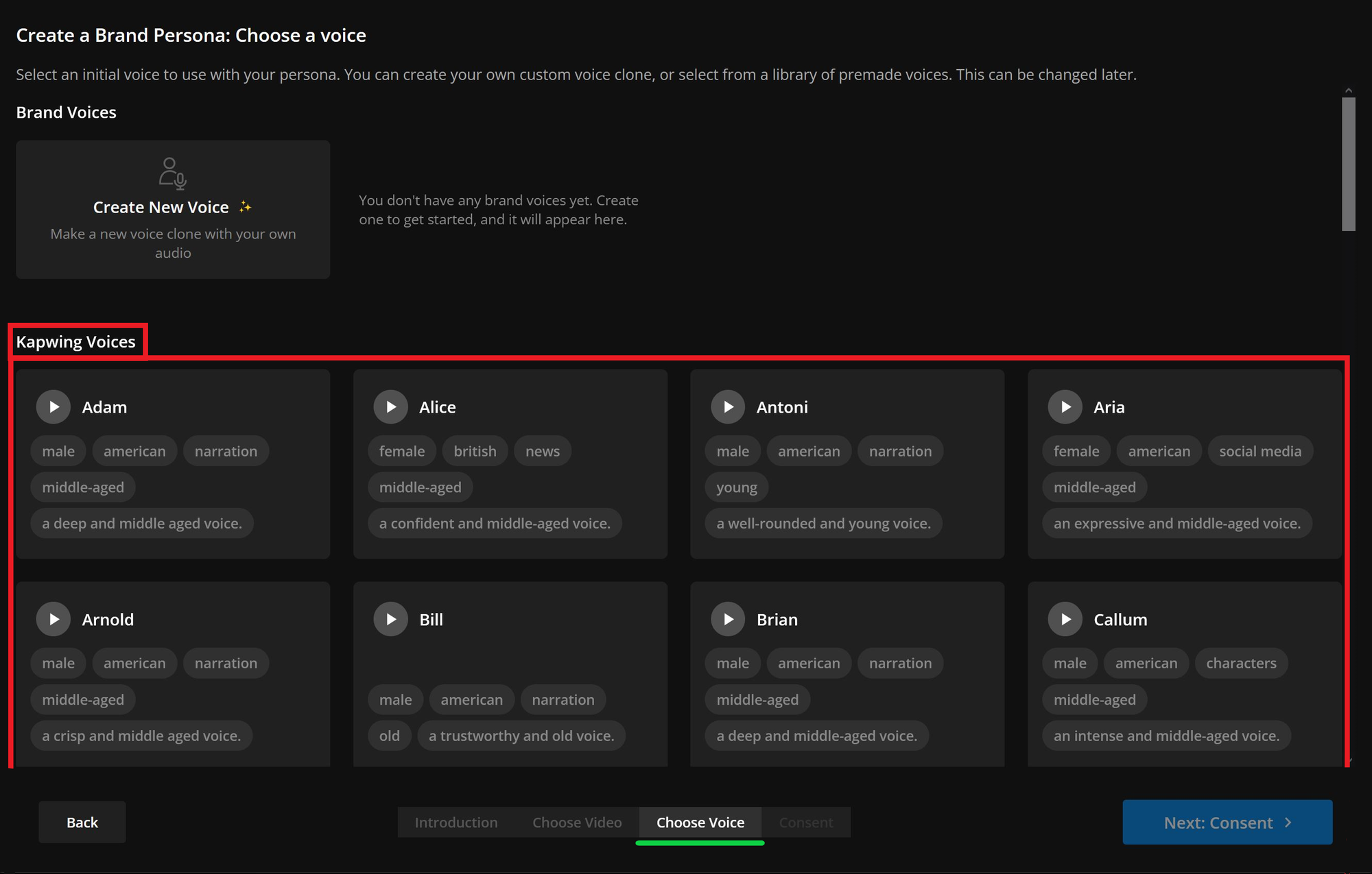 Next, choose a voice for your AI baby. Kapwing offers more than 50 voice options. If none of the defaults fit your needs, or you want to replicate a specific voice, you can select the Create New Voice option instead.