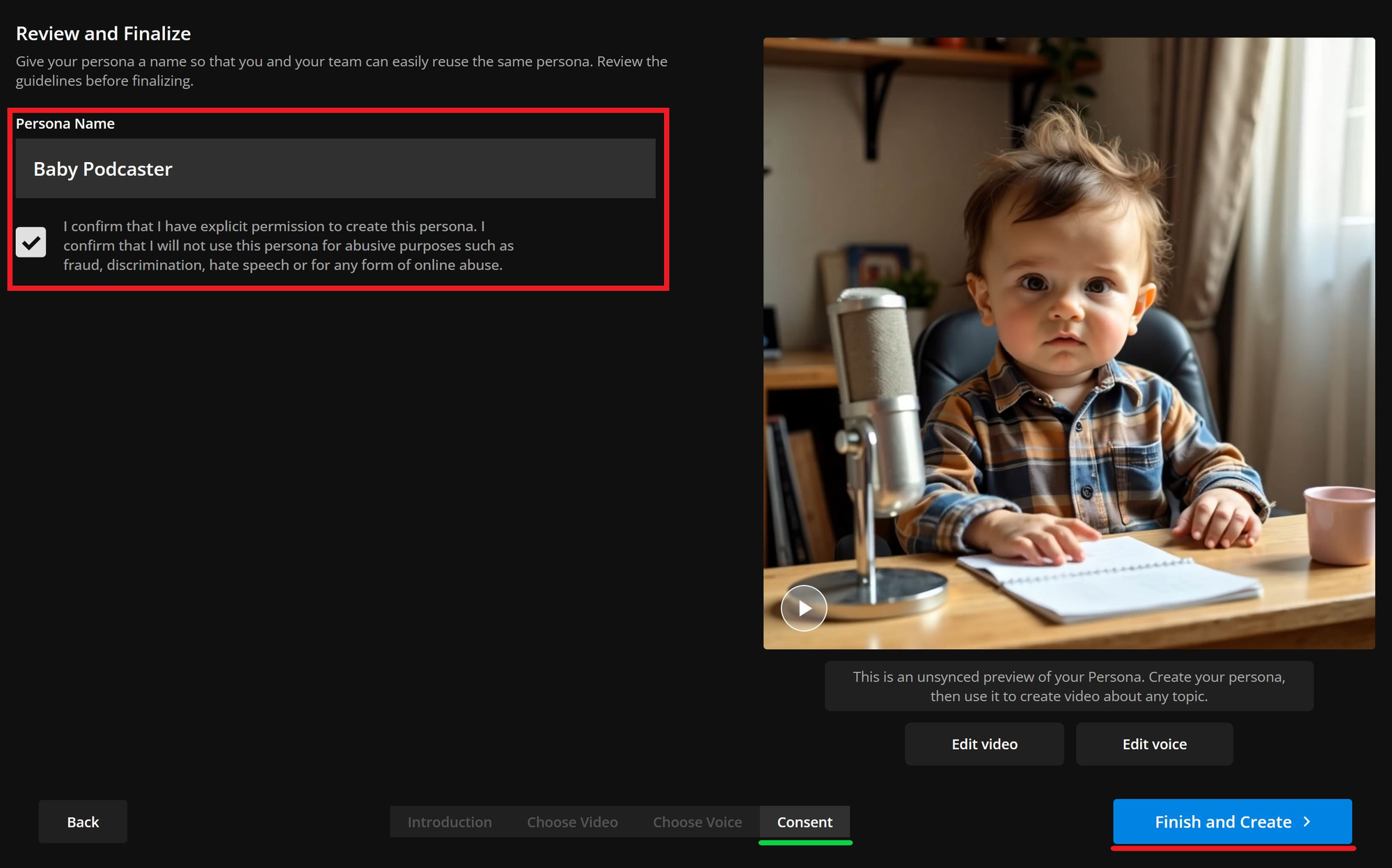 Once you've selected your voice, name your new persona and click Finish and Create.