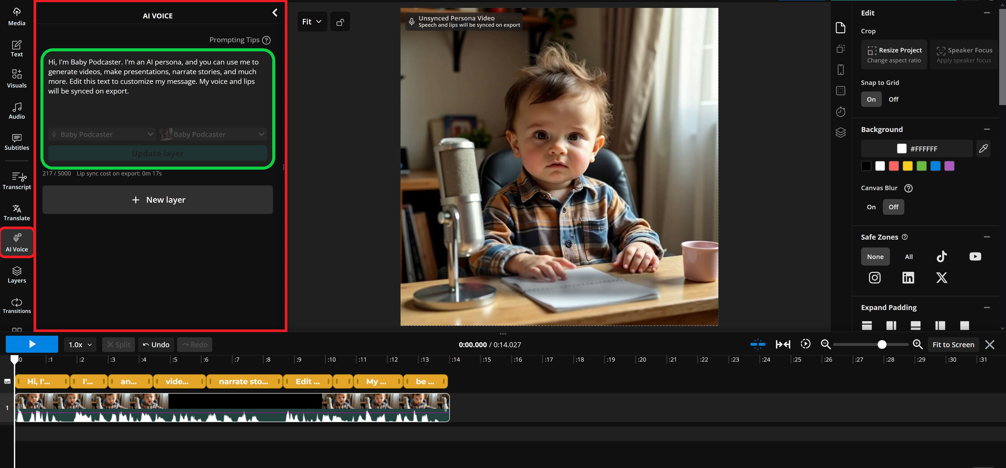 Start by selecting your newly created persona from the AI Voice menu to add it to your timeline.