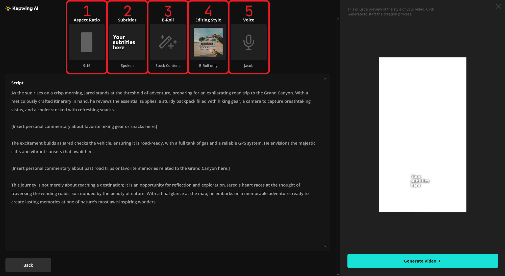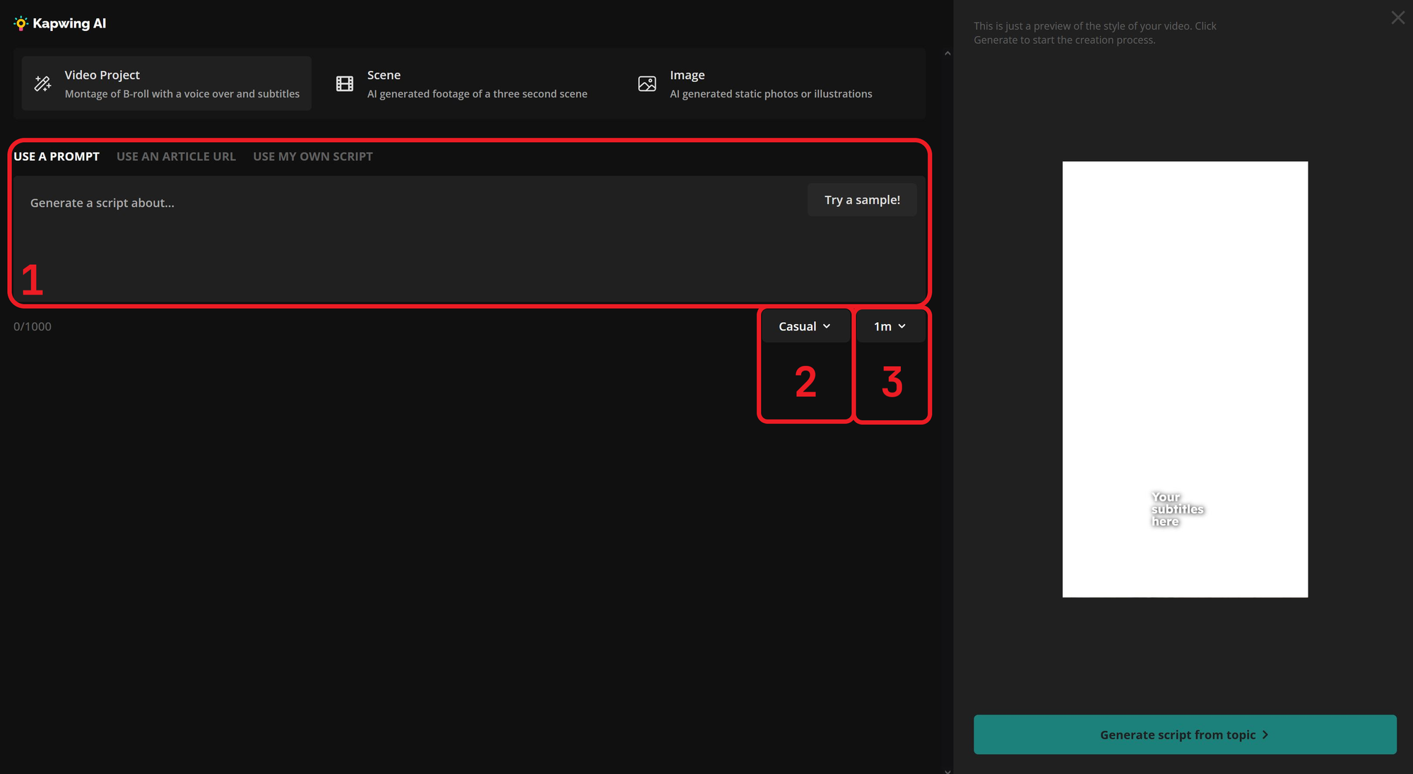I left my settings as pictured above, with the script tone set to Casual and the video duration at 1 minute. For my prompt, I asked the generator to write: