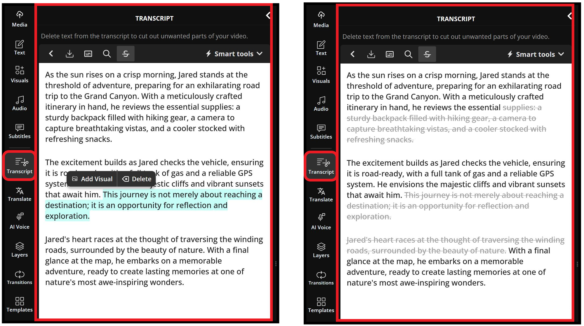 Since you will want room for your own commentary, the next step is to remove portions of the existing transcript to free up some space. To do this, open the Transcript menu in the left-hand sidebar and highlight the text you'd like to delete.