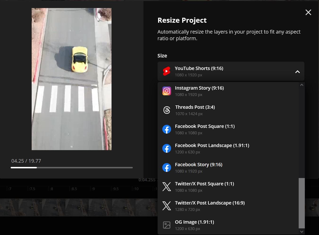 - Resizing Your Videos: Each social media platform has unique aspect ratio requirements, so resizing is essential for optimal presentation. Kapwing's resize tool has over 15+ presets to instantly resize videos.