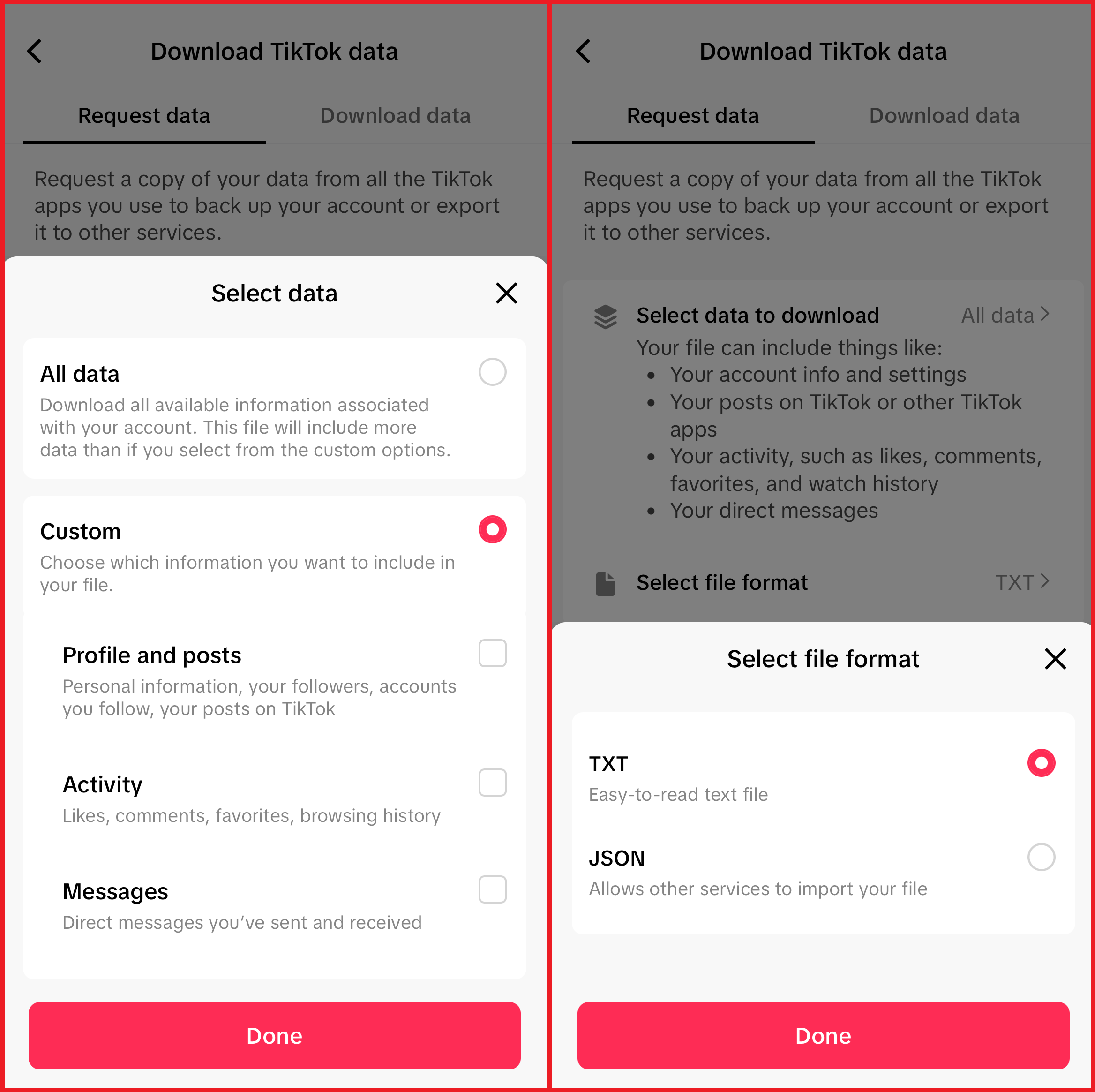TikTok allows you to customize your export by selecting the specific data you want and your preferred file format: