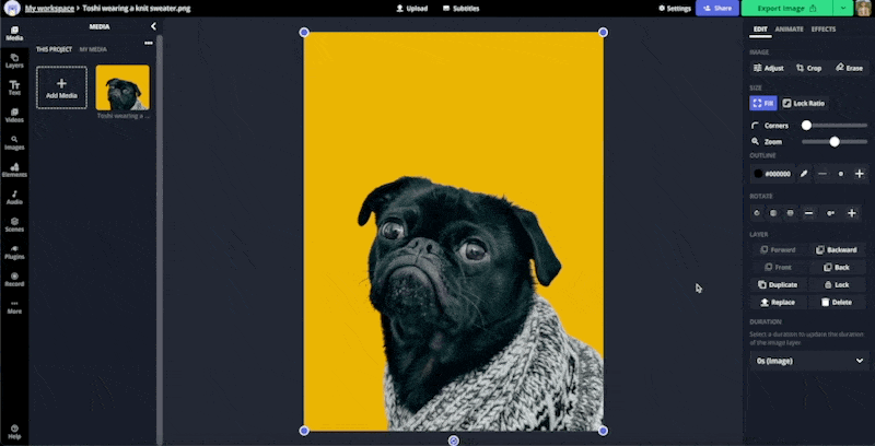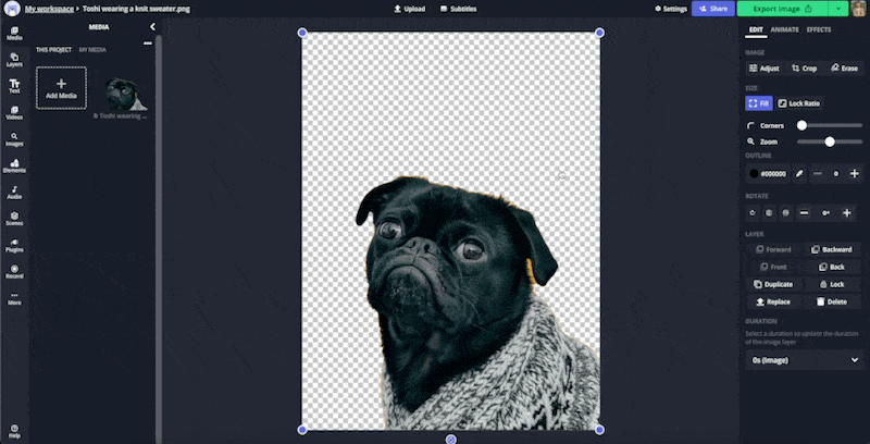 On the computer, you can click and drag your file into the canvas, or select "Upload a file." On your phone, you can upload directly from your Photos Library. You can also search for copyright-free images from the left navigation bar. As you can see in my example, I chose a pug wearing a knit sweater.