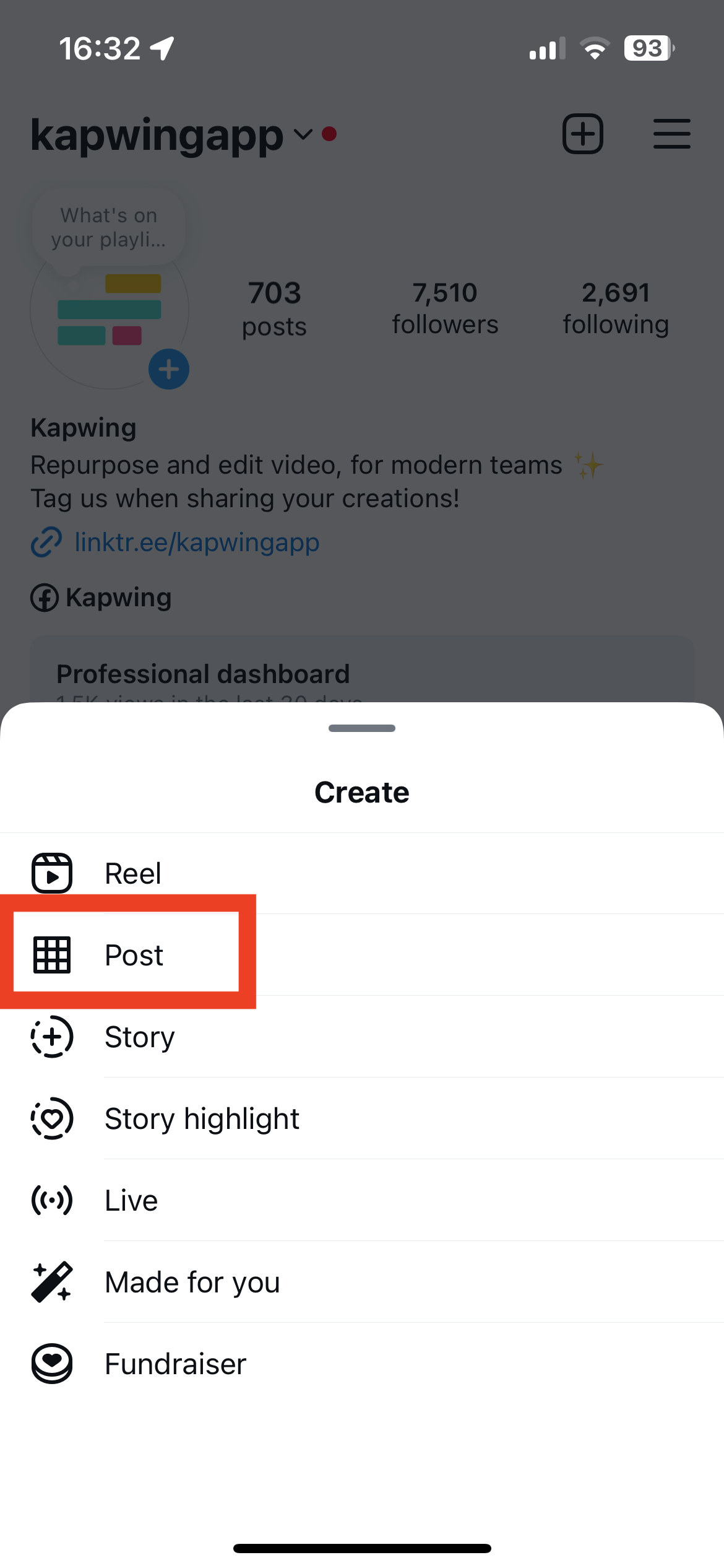 Next, click on the top right "plus" sign and select "post" from the popup. Here, you'll be able to your downloaded Top 9 layout and add a caption.