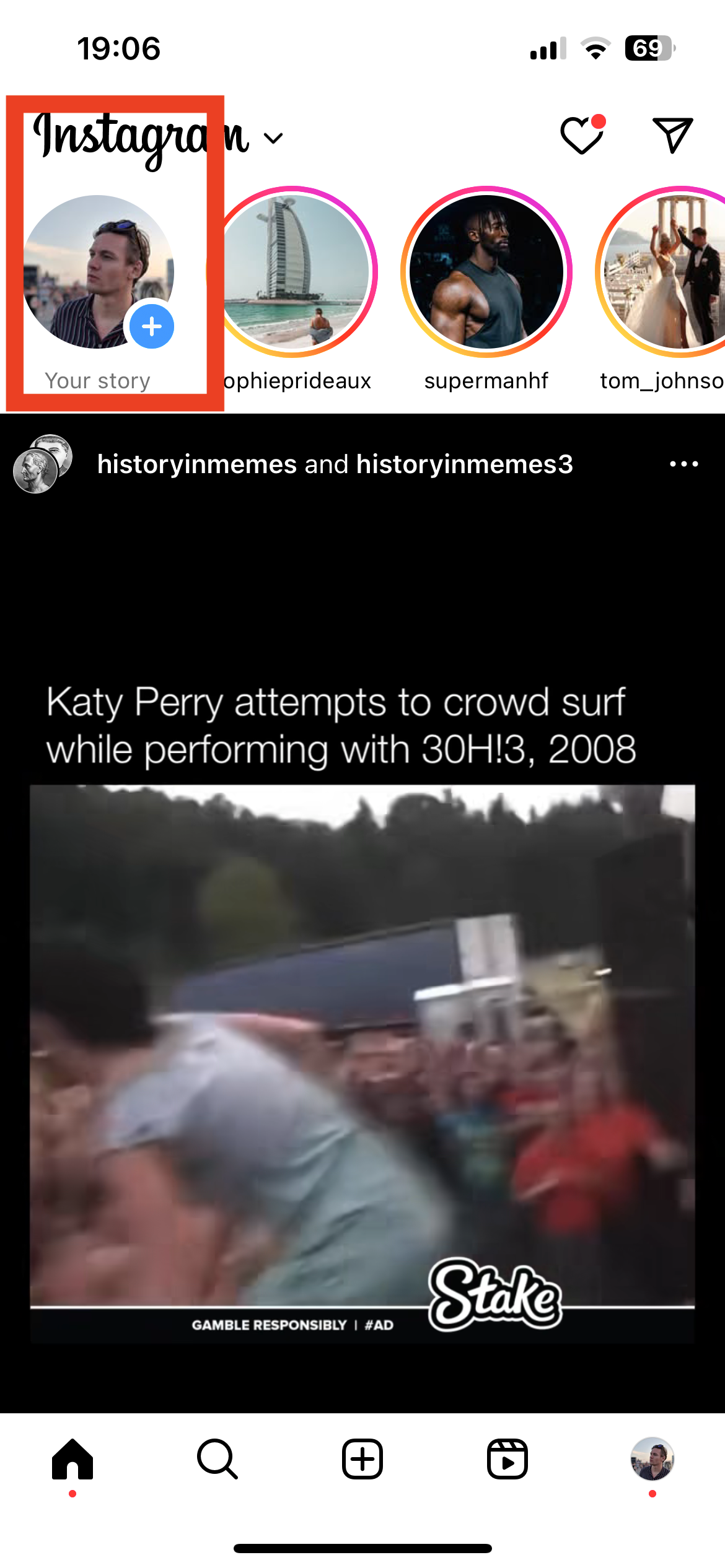 To post a collage as an Instagram Story, select the "Your Story" icon from your homepage at the top of the screen.