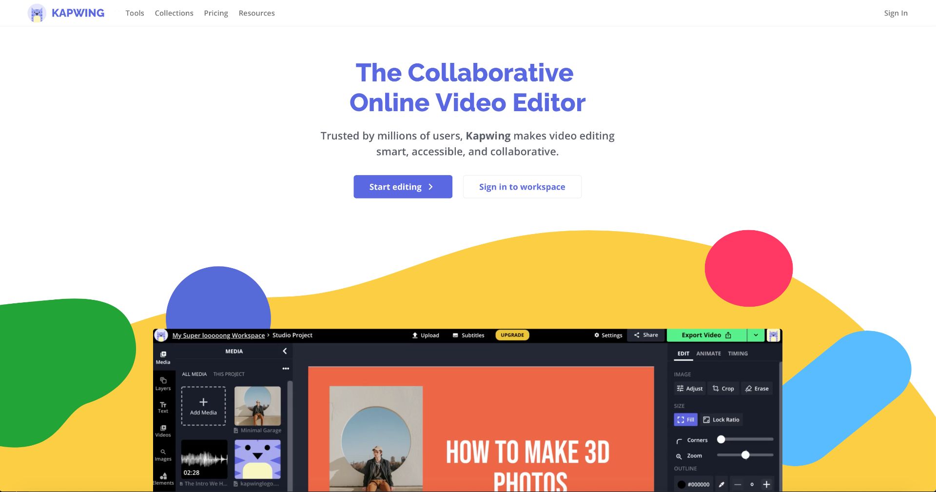 Let's begin by uploading a video or audio file into the Kapwing Studio. You can click Start Editing to open the Studio or Sign in to a Workspace to create or access an existing workspace.