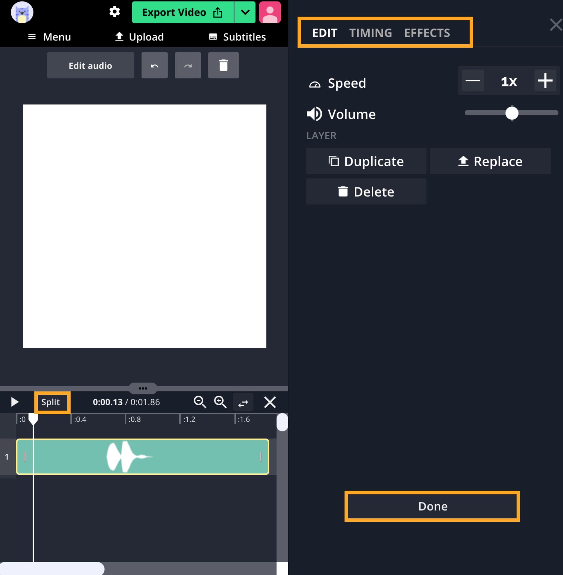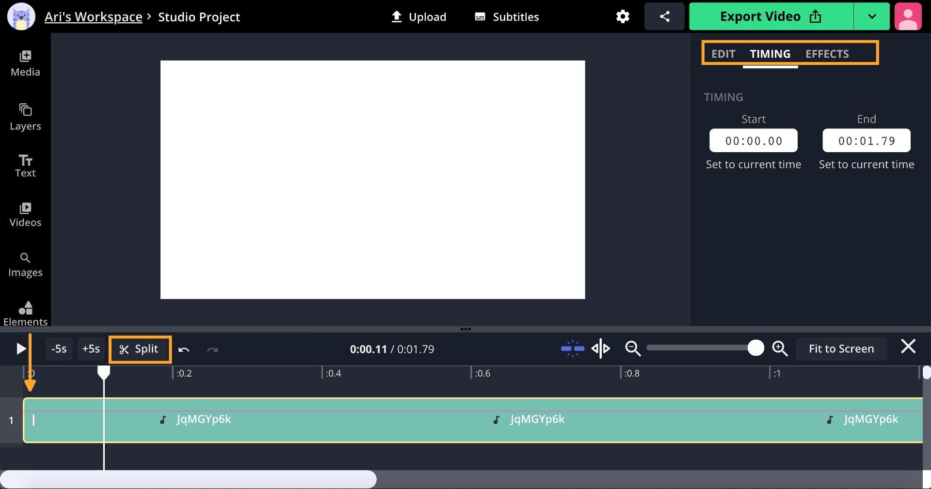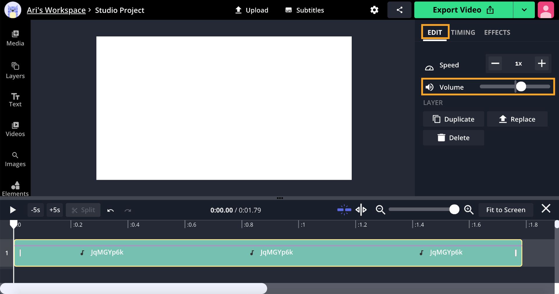Drag and drop a file, click to upload, or paste a link to add your video or audio to the Studio. When the upload is complete, the layer will appear on the timeline beneath the canvas for you to trim, cut, and split until you have the perfect notification sound.