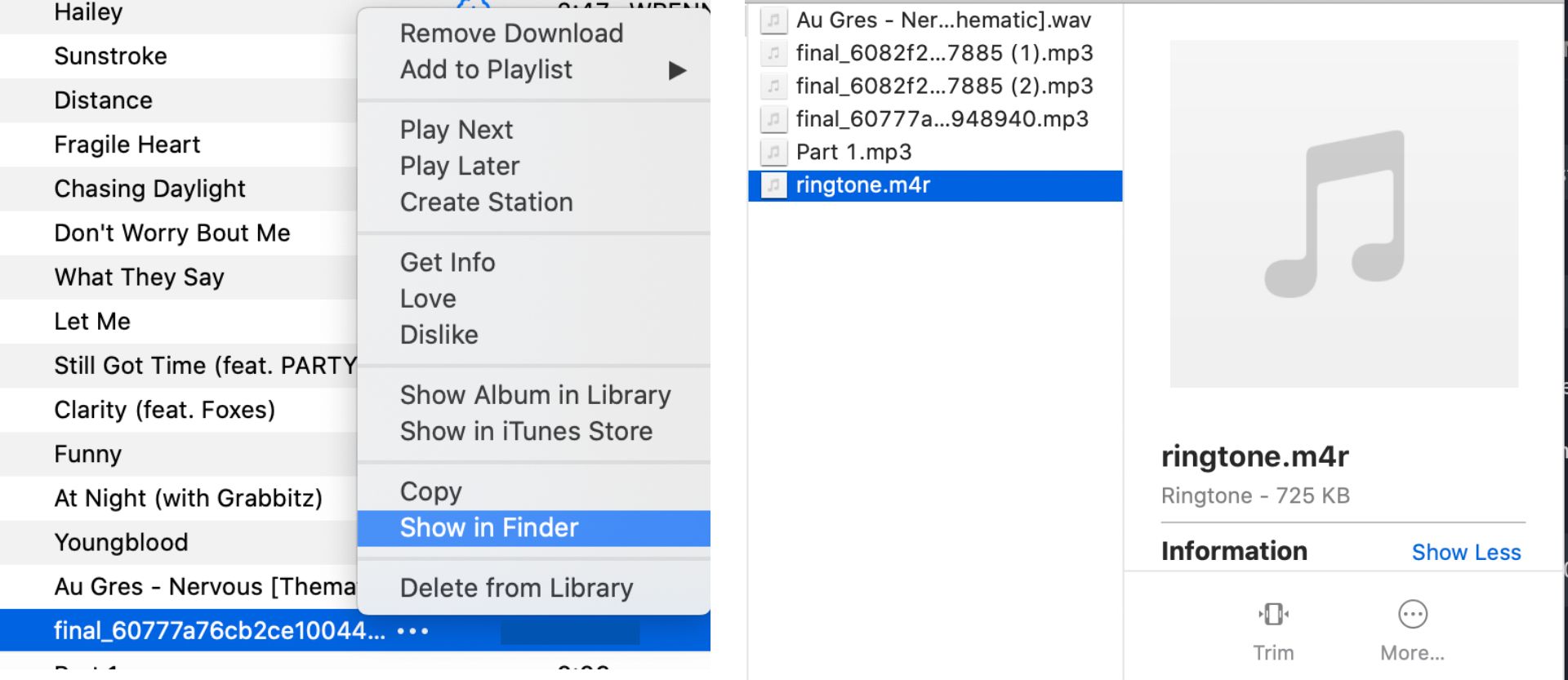 Right-click the duplicate version, then click Show In Finder. Manually change the file extension to M4R by clicking the filename and typing M4R at the end. You can delete the other version from the music library.