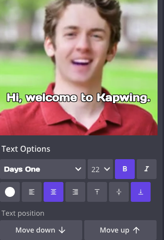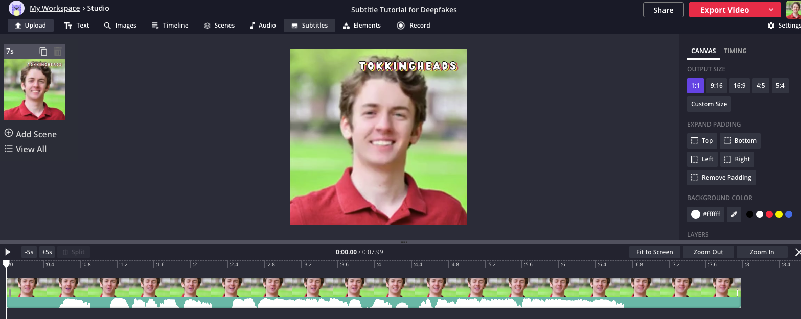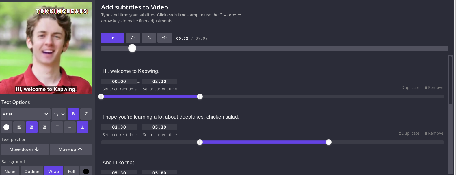 Subtitles are a great and simple way to make your deepfake video better and are proven to increase engagement and watch-time on social media. Luckily, Kapwing can help you out with the Caption Tool.