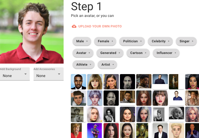 After heading to Tokkingheads.com or opening up the mobile app, you'll see a prompt to pick your image. Images with a clear distinction between the background and foreground seem to work the best. You can upload your own or pick from their suggested list of celebrities. You also have the option to choose a new background for your subject and even add a Santa hat!
