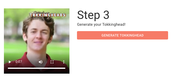 Generate your TokkingHead! Click the orange button that says 'Generate TokkingHead' and you're done. You'll be able to download your video file in standard or high quality resolution and also share to Twitter, FB, or copy a link. There is a watermark, but as linked above in the Wombo section you can bring your video into Kapwing's crop tool and cut off the top portion of the video, if you choose.