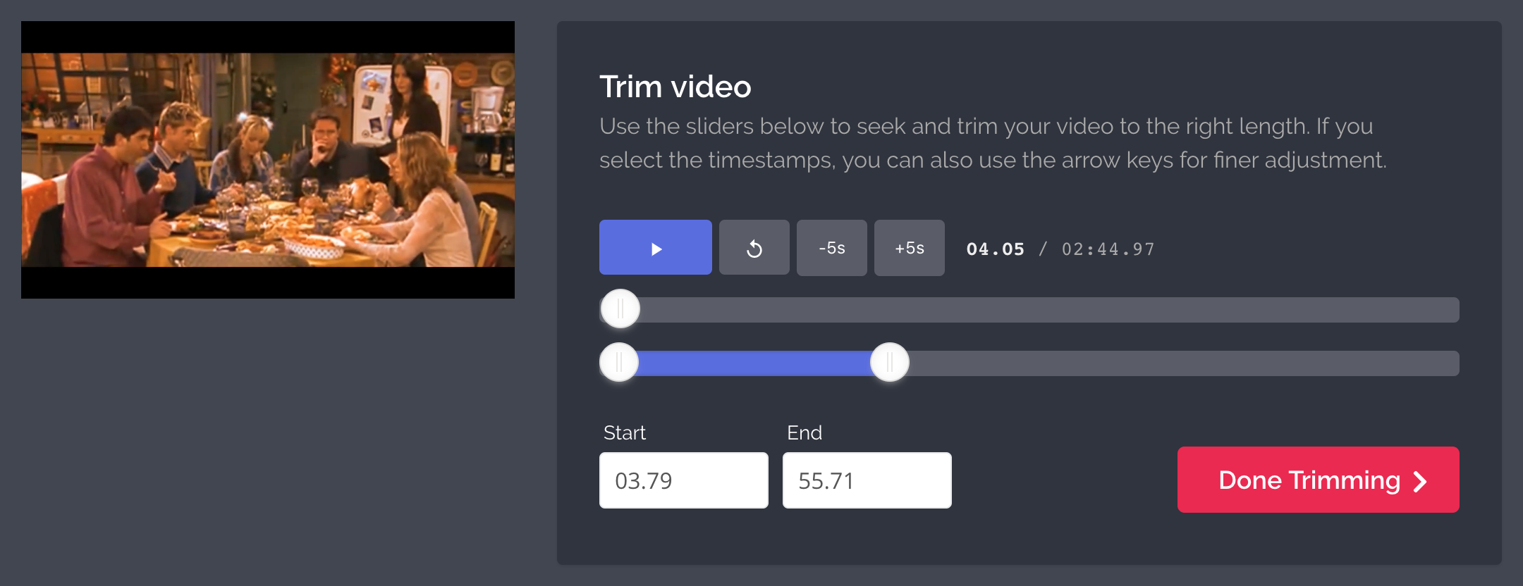 - Trim videos by clicking “Trim” on the right side when the video is selected, then move the ends of the purple bar to indicate the section you want to use.