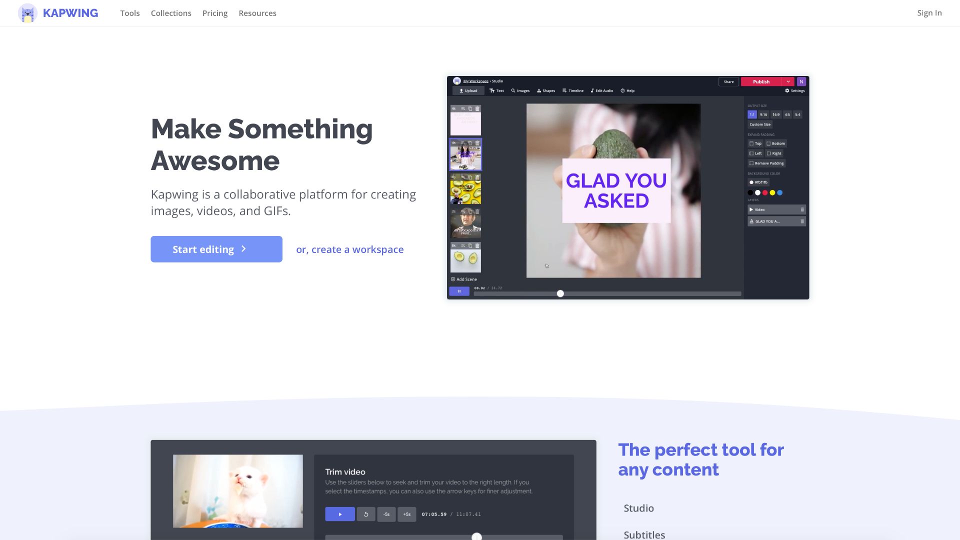Head over to Kapwing, click start editing and start with a blank canvas to launch Kapwing Studio. This free online video editor can be used on any iPhone, Android, PC, or tablet. I highly recommend using a PC for this tutorial and a Chrome, Safari, or Firefox browser will do.