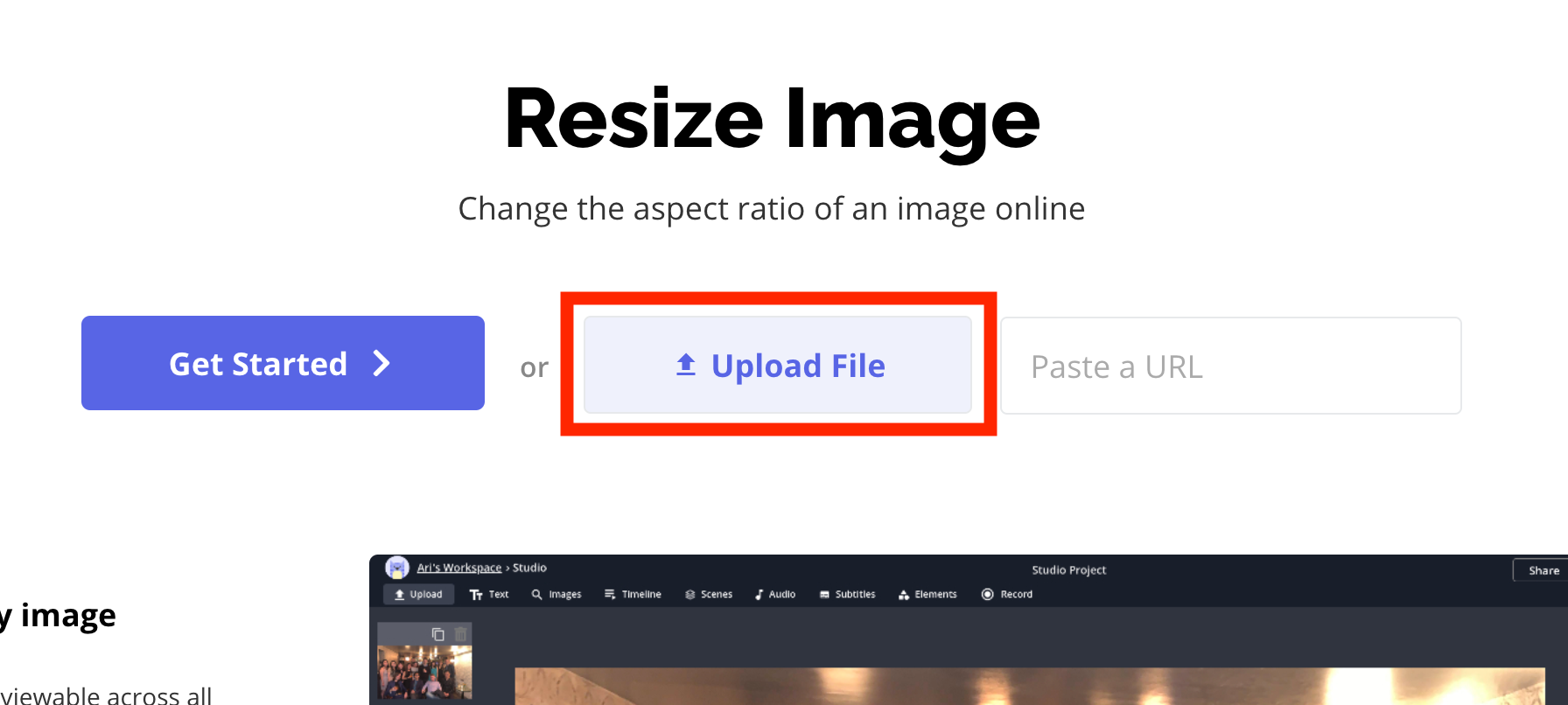 Head to Kapwing’s Image Resize tool, where you will see three options of what you how you can put your image in the editing studio: Get Started, Upload File, and Paste a URL. We are going to assume that you have the picture you want to use on your computer, so click on Upload File and that find the image wherever you have it stored and upload it.
