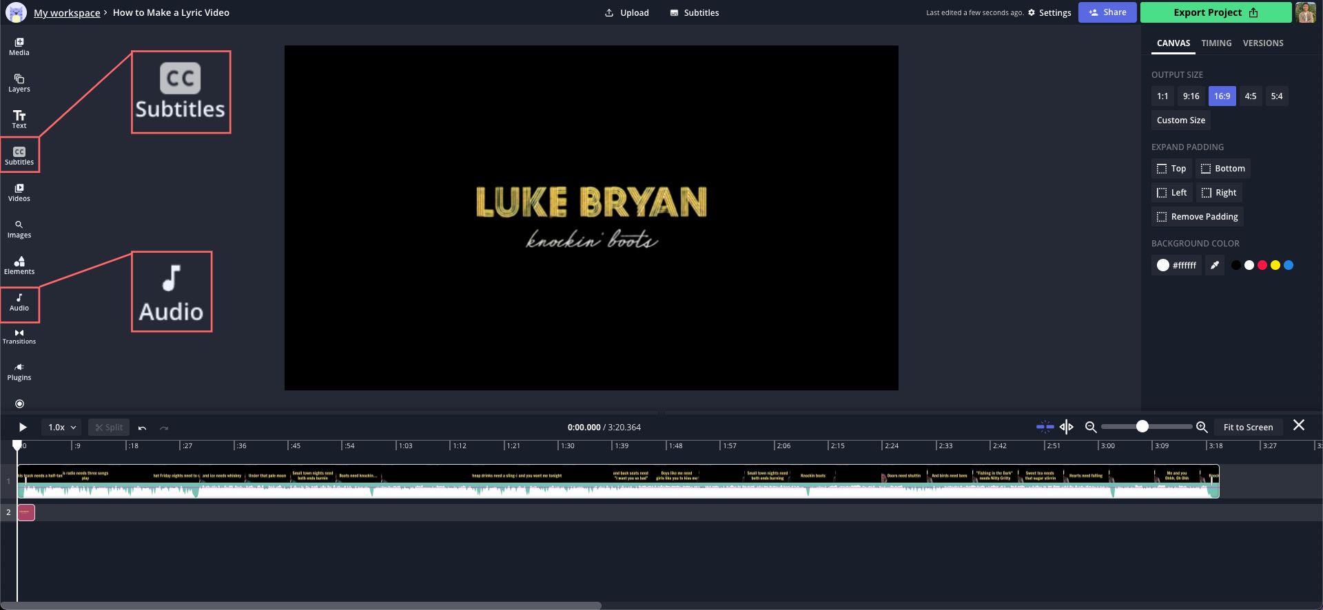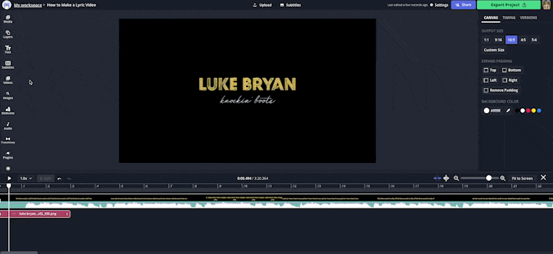 Use any video editor to make a music video with lyrics. Make sure the video editor you’re using supports your video and audio file types. Upload your video and music and overlay them in the timeline. Depending on your video editor, you can automatically generate subtitles for your music video or manually type in the text and adjust the timing yourself. A great lyric video maker for both these features is Kapwing, the online video editor. With countless of text fonts, styles, colors, and effects, you’re bound to make the greatest music video with lyrics online.