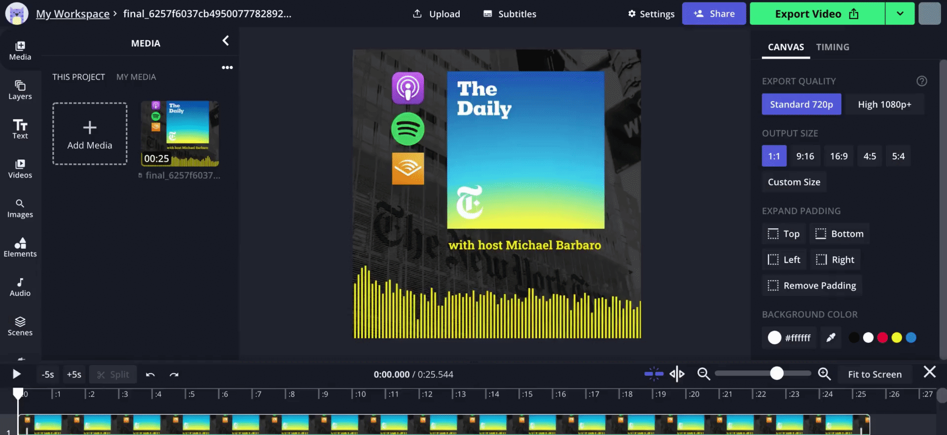 Export your podcast and upload directly to podcasting platforms like YouTube, Spotify, SoundCloud, and more. Download a file or share your own podcast link to others.