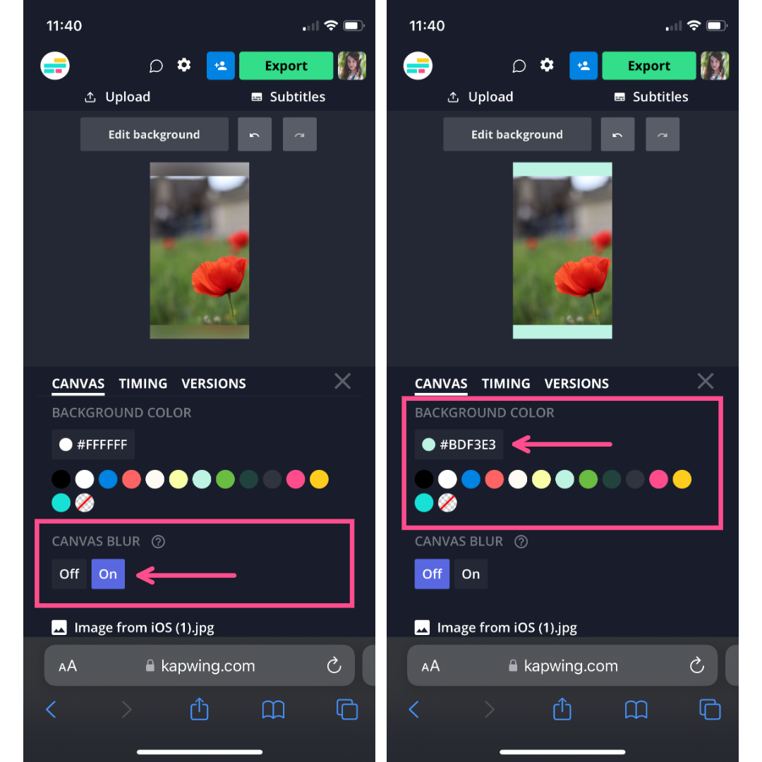 To add a subtle background blur, select Edit background and turn Canvas Blur on. To add a colored background, select Edit background and choose from the preset colors or a custom color in the Background Color section.