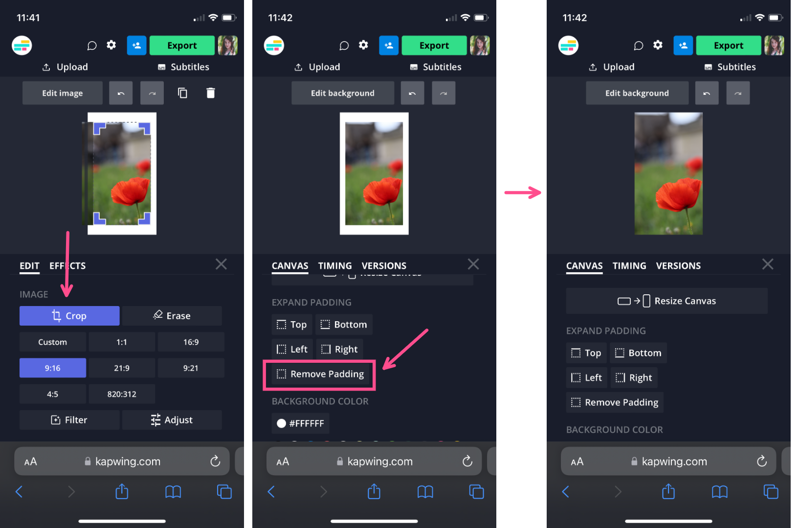 Once you've uploaded your image, there might be blank canvas still visible behind the photo. You have a few options here. You can crop your photo to fill the whole frame. With the photo selected, click Edit image and then Crop with the 9:16 preset.
