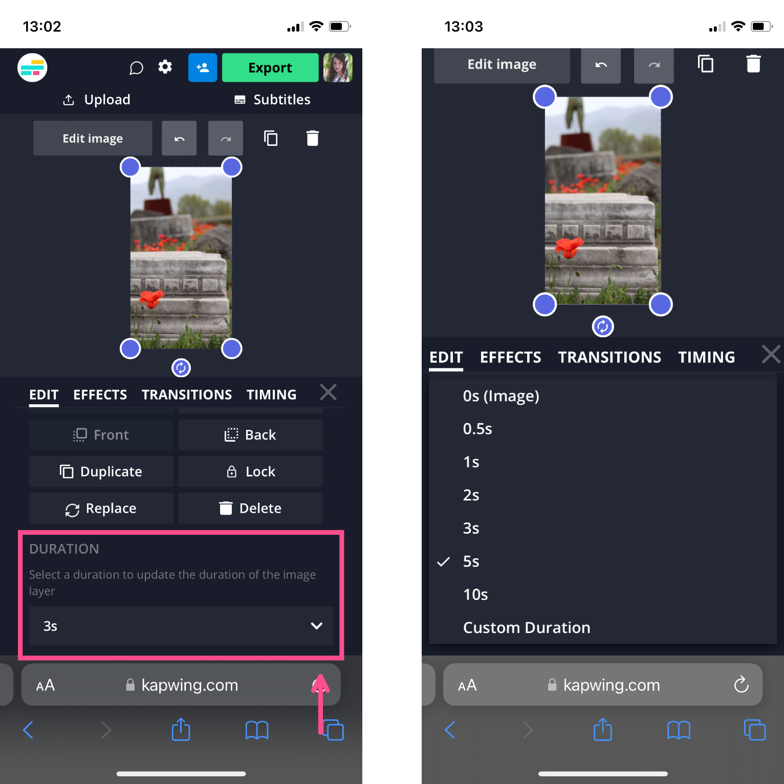 Once they're arranged the way you want them, set the duration on each photo. Select Edit image, then scroll down to Duration and choose from the drop down options or enter a custom duration.