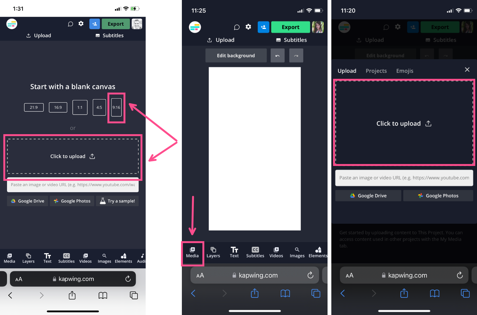 Select Click to upload to add your photo to the editor if your photo is already the correct aspect ratio for Reels (9:16). If not, choose the 9:16 option under Start with a blank canvas instead. Once you've opened the project, you can add your photo to the 9:16 canvas by using the upload options inside the Media tab.