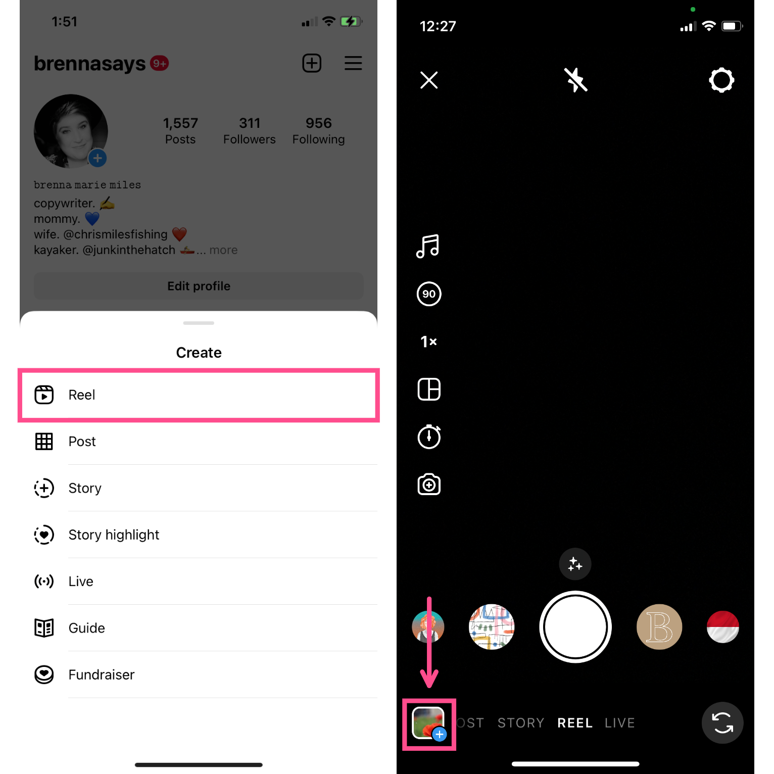To do this, go to your Instagram profile and select the + icon and then Reel. You can also add a Reel by swiping right from your home screen to open your camera in Instagram, the same way you would to add a new Story.