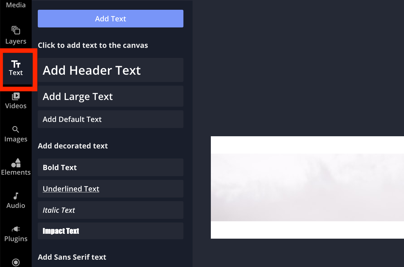 In order to add some text to your banner for some flair, you can look to the left-side of your screen for the Text icon. Click on this and a new menu will appear, on which you can choose from a variety of different text options and styles. You can look through everything on the menu and find which one is right for you.