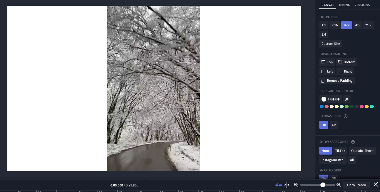 Once the video has loaded into the timeline, you can change the aspect ratio. On desktop, go to the right-hand side panel and choose 16:9 as the output size. On mobile, select Edit Background and choose 16:9 as the output size.