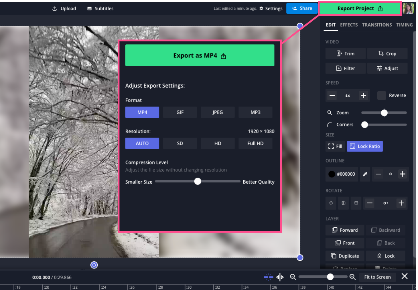 After changing the aspect ratio and scaling the video, you’re ready to export! Click the Export Project button and select your export format and resolutions settings. When the video finishes processing, click the Download button and the it will be saved to your device.